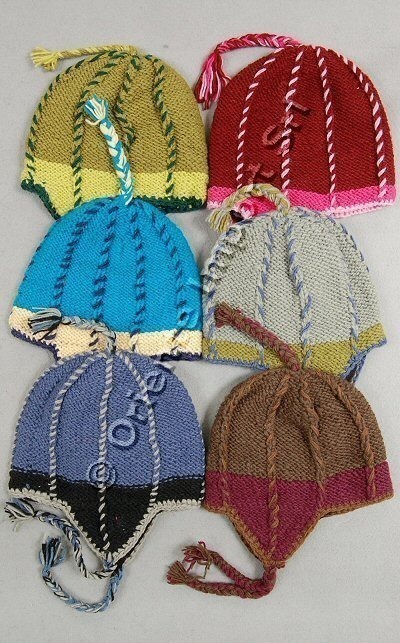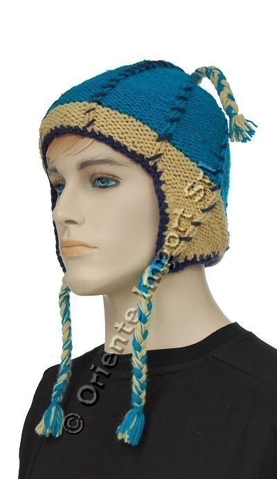 BERRETTO IN LANA COLORATA CON RIGHE VERTICALI, COPRIORECCHIE E TRECCINE, INTERNO IN PILE.
