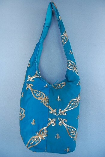 BORSA THAILANDESE TRACOLLA , BORSETTA TONDA IN GIACINTO D'ACQUA.FODERA IN COTONE, CHIUSURA CON CERNIERA, MISURA SENZA MANICO 22X16X8 CM.