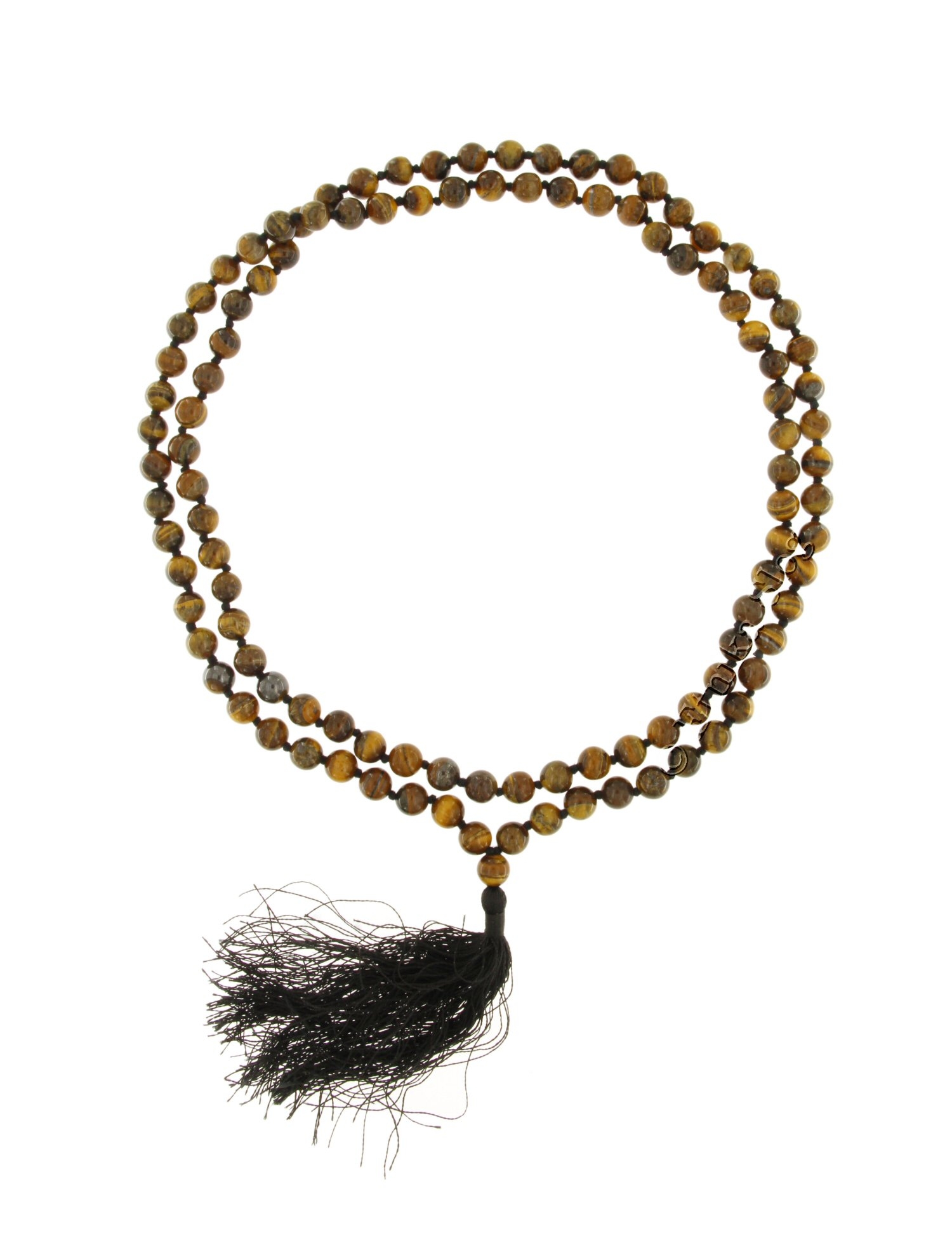 COLLANA MALA IN OCCHIO DI TIGRE CON FIOCCO COTONE MARRONE , SFERE MM 8 .