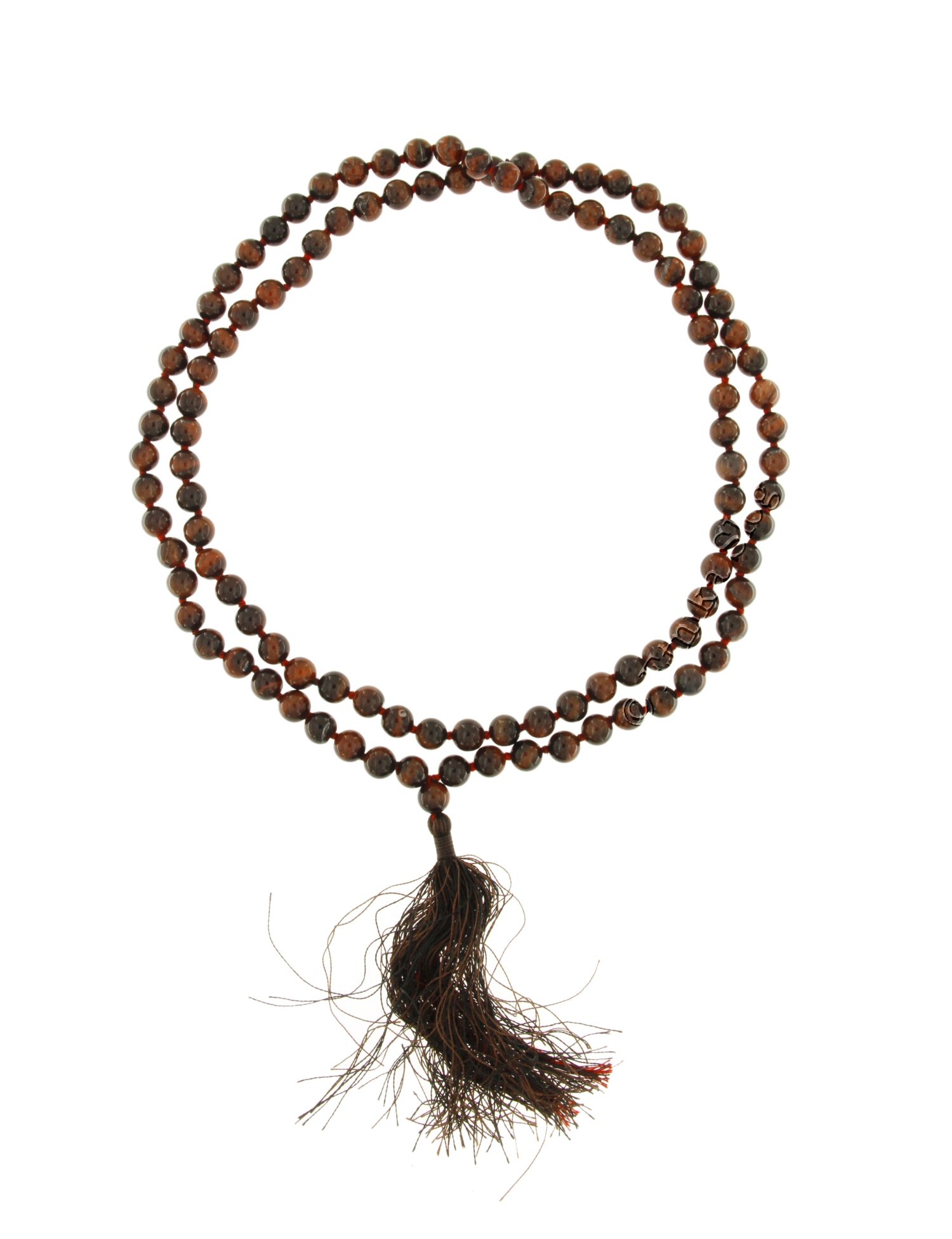 COLLANA MALA IN OCCHIO DI BUE CON FIOCCO COTONE MARRONE/ROSSO , SFERE MM 8 .
