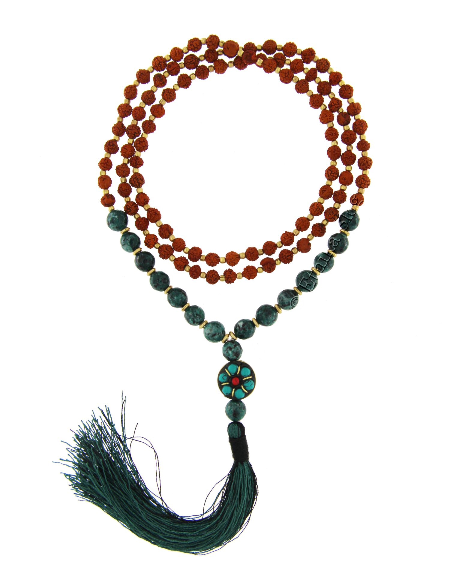 COLLANA MALA SEMI DI RUDRAKSHA 108 SEMI DA 6 MM DIVISI DA SFERA IN METALLO.