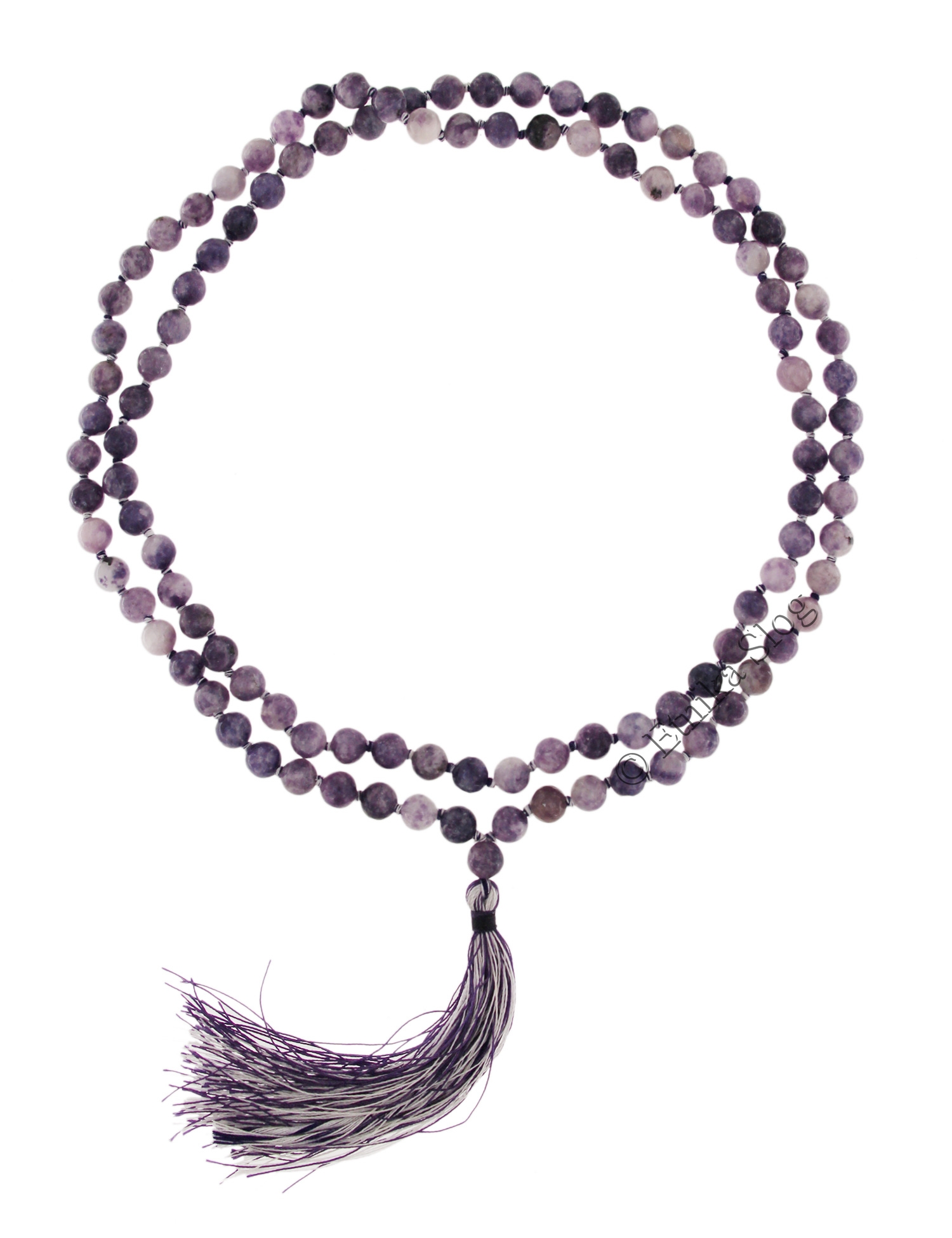 COLLANA MALA IN LEPIDOLITE CON FIOCCO COTONE VIOLA , SFERE MM 8 .