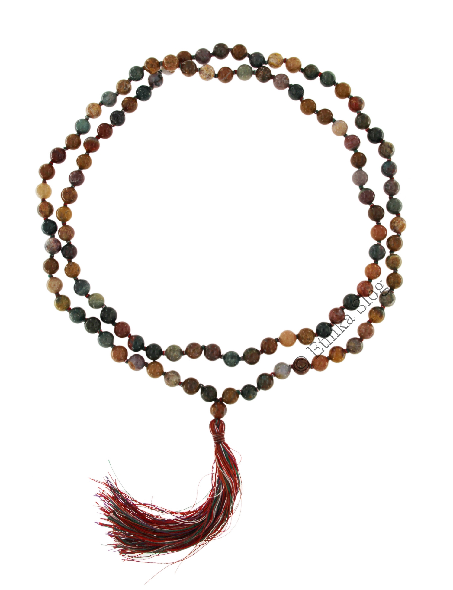 COLLANA MALA IN BLOODSTONE CON FIOCCO COTONE MULTICOLORE , SFERE MM 8 .