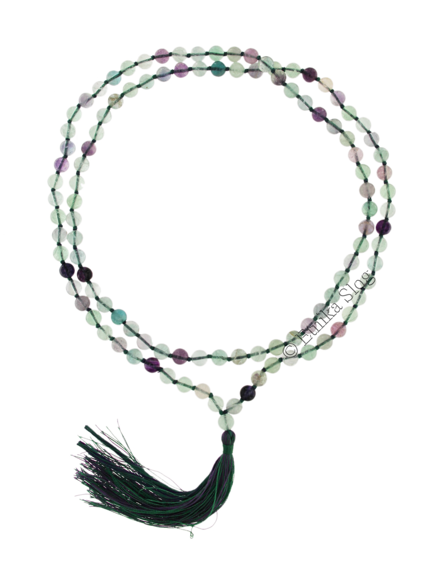 COLLANA MALA IN FLUORITE CON FIOCCO COTONE VERDE VIOLA , SFERE MM 8 .