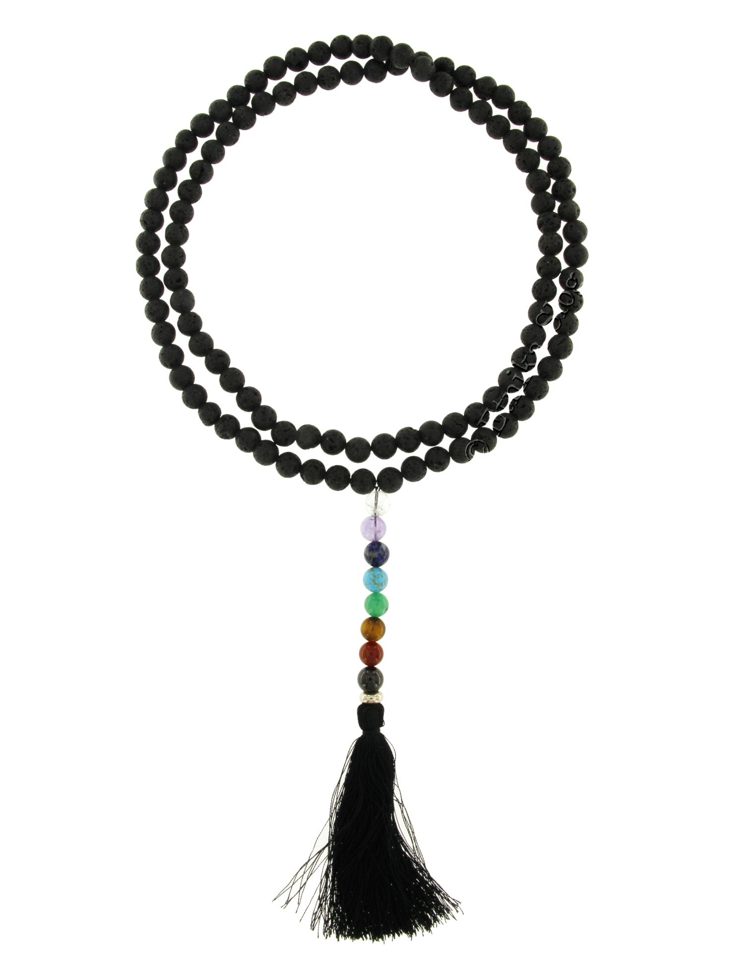 COLLANA MALA IN PIETRA LAVICA CON PENDENTE 7 PIETRE CORRISPONDENTI AI CHAKRA , SFERE MM 8 .