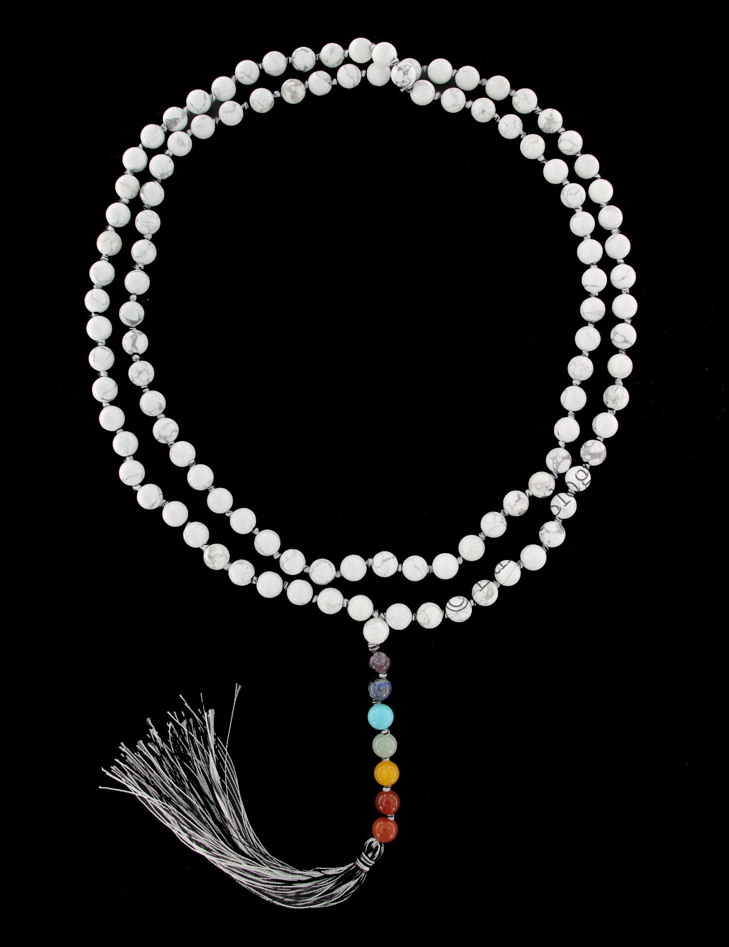 COLLANA MALA IN HOWLITE BIANCA CON PENDENTE 7 PIETRE CORRISPONDENTI AI CHAKRA , SFERE MM 8 .