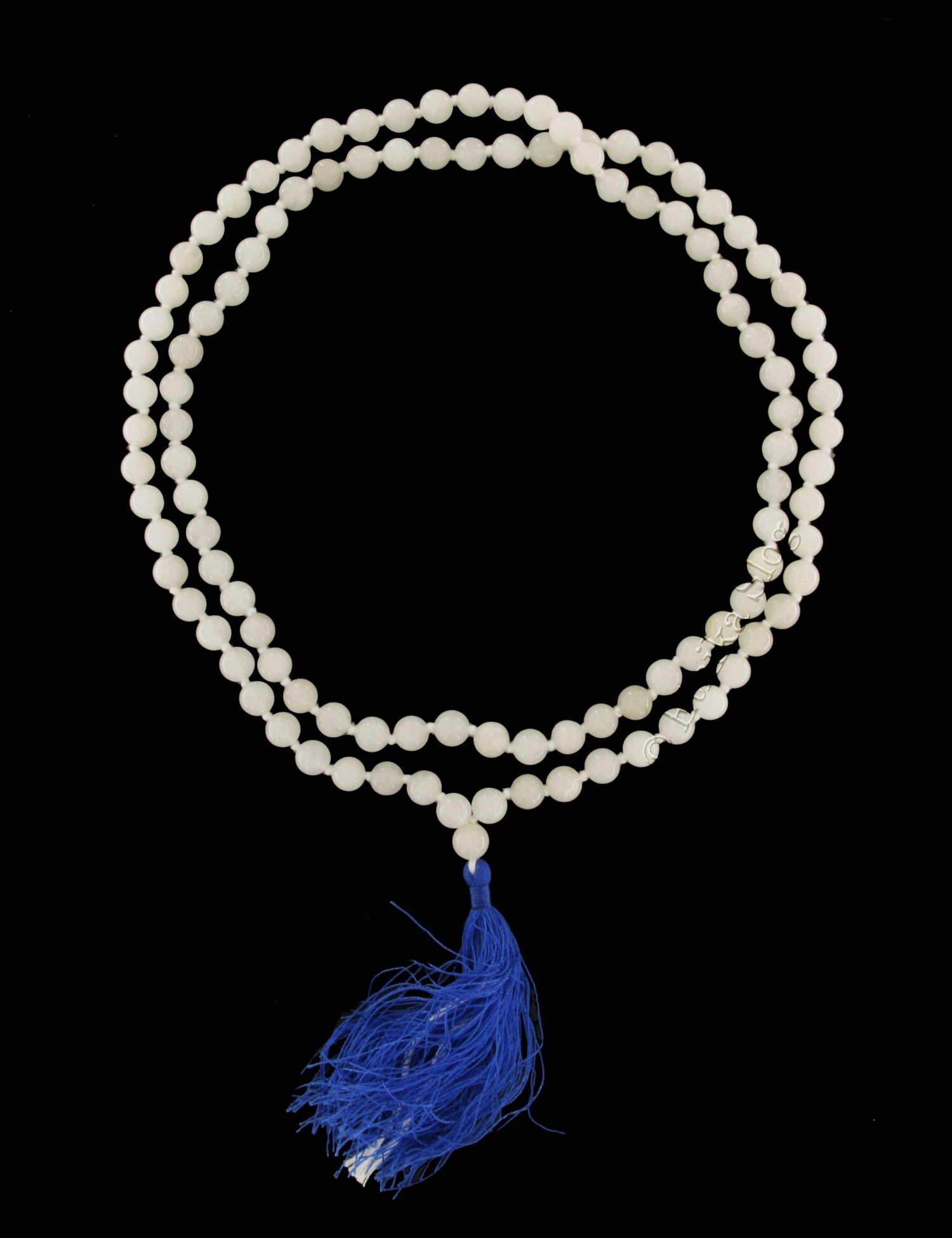 COLLANA MALA IN QUARZO BIANCO LATTEO CON FIOCCO COTONE ROSSO O BLU , SFERE MM 8 .