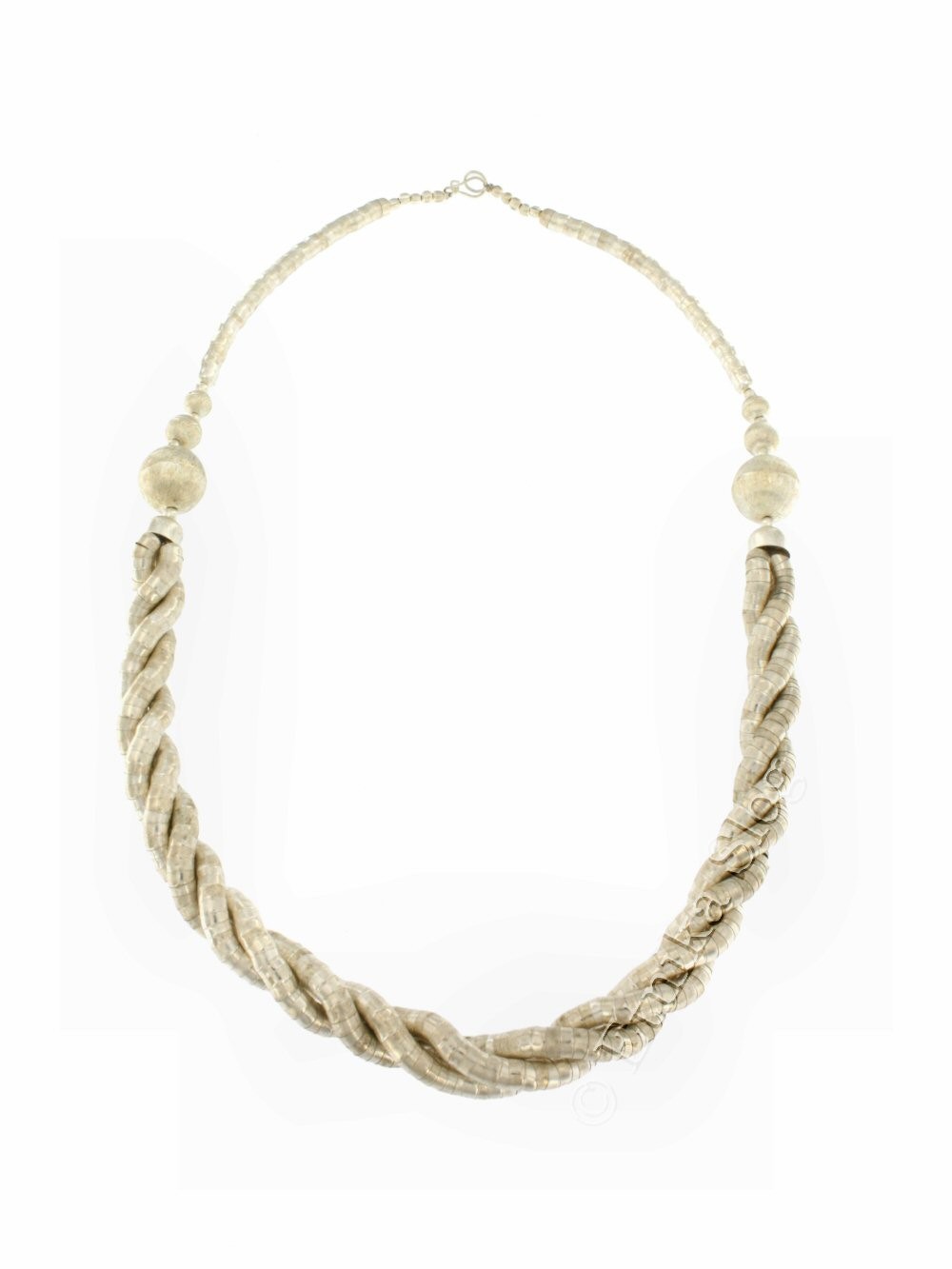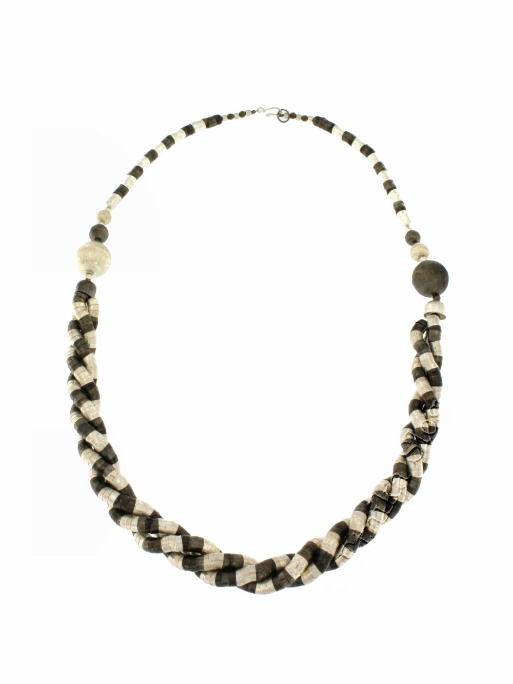 COLLANA IN METALLO BIANCO, SEZIONE TONDA, FILI MONOCOLORE O 2 COLORI INTRECCIATI E SFERE.