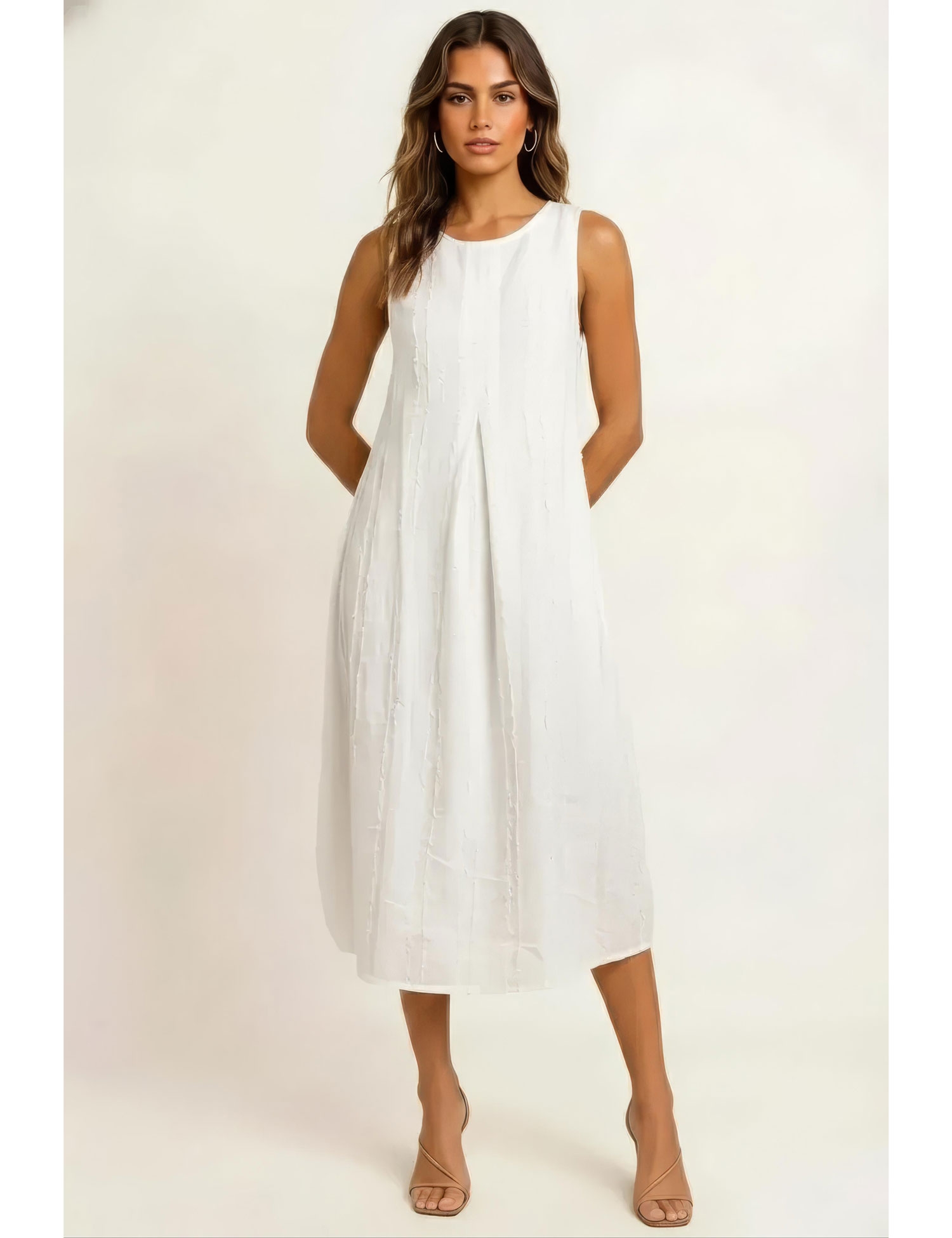 VESTITO MEDIO IN COTONE BIANCO, CON SPALLINA LARGA, COLLO ROTONDO, MODELLO ARROTONDATO, CON 2 TASCHE ALL'INTERNO E UNA PENS DAVANTI, SCHIENA COPERTA.