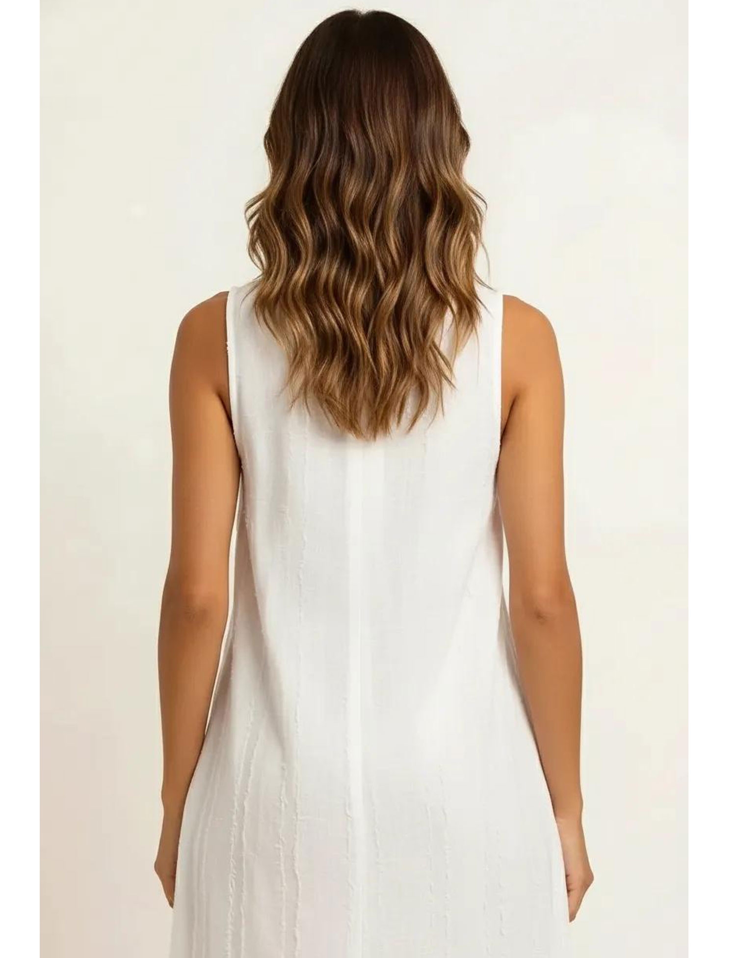 VESTITO LUNGO IN COTONE BIANCO, CON SPALLINA A LACCETTO CON INCROCIO DIETRO, COLLO APERTO, CON DUE TASCHE ALL'INTERNO, MODELLO OMBRELA CON TAGLIO DIAGONALE PER UNA MIGLIORE VESTIBILITA' E BALZA FINALE, CON SCHIENA SCOPERTA.TAGLIA UNICA - FREE SIZEMATERIALE : 100% COTONE BIANCO.