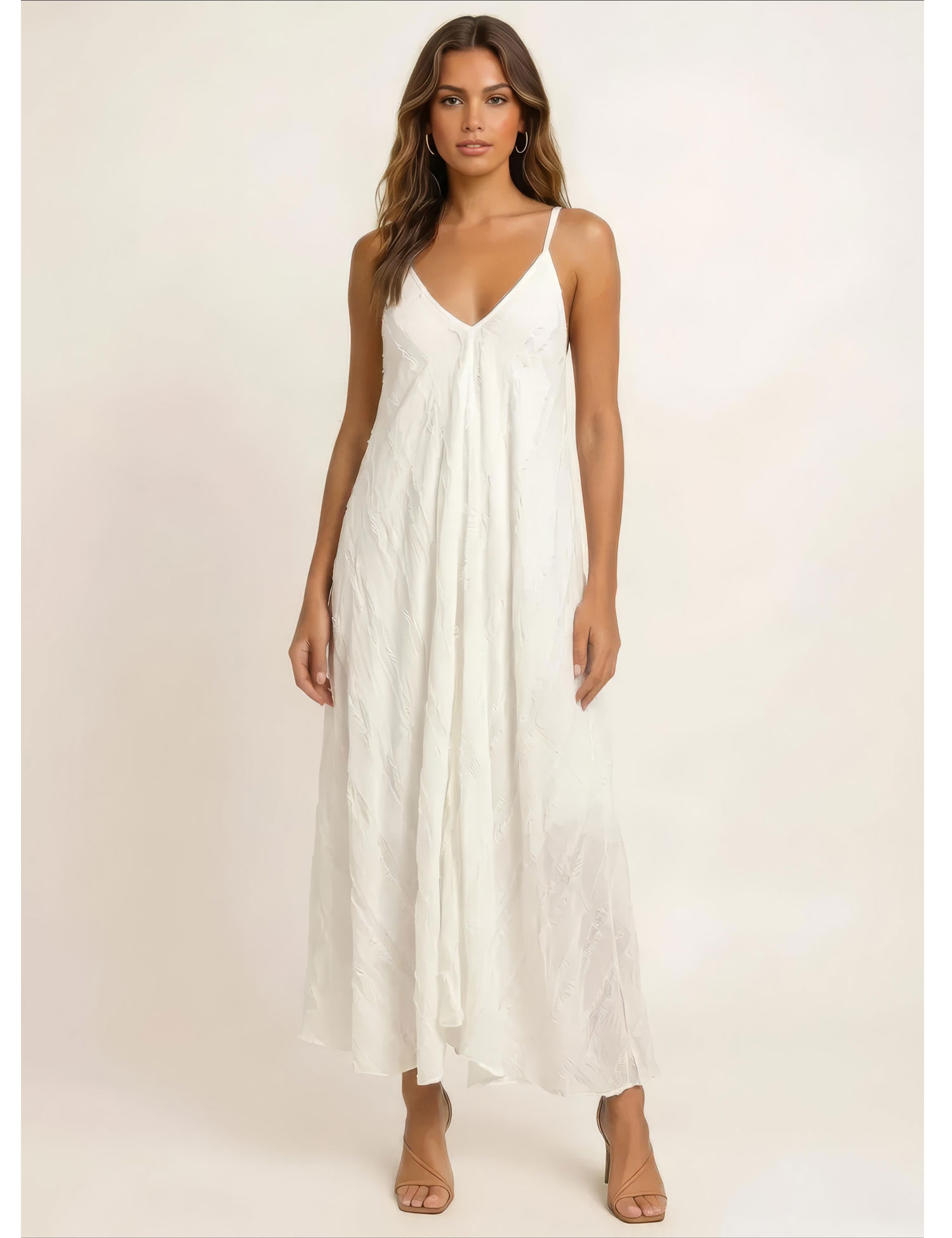 VESTITO LUNGO IN COTONE BIANCO, CON SPALLINA A LACCETTO REGOLABILE, COLLO A V, CON DUE TASCHE ALL'INTERNO, MODELLO OMBRELA FODERATO MOLTO AMPIO, SCHIENA POCO SCOPERTA.