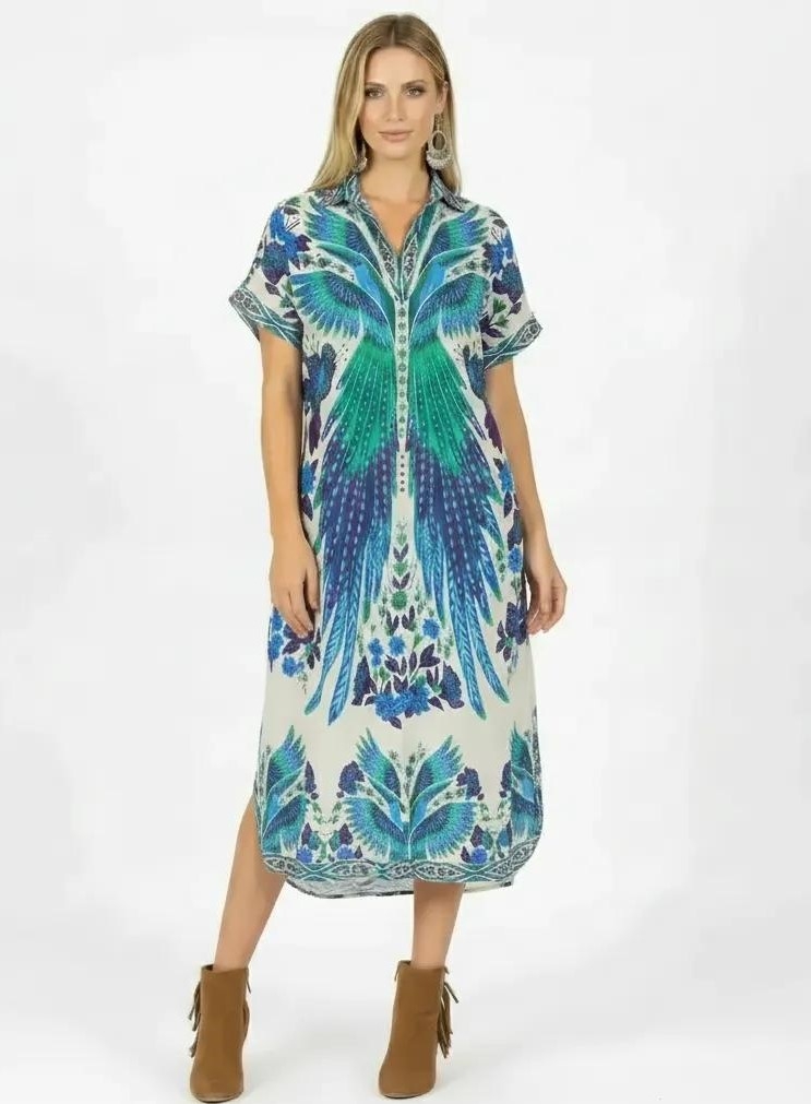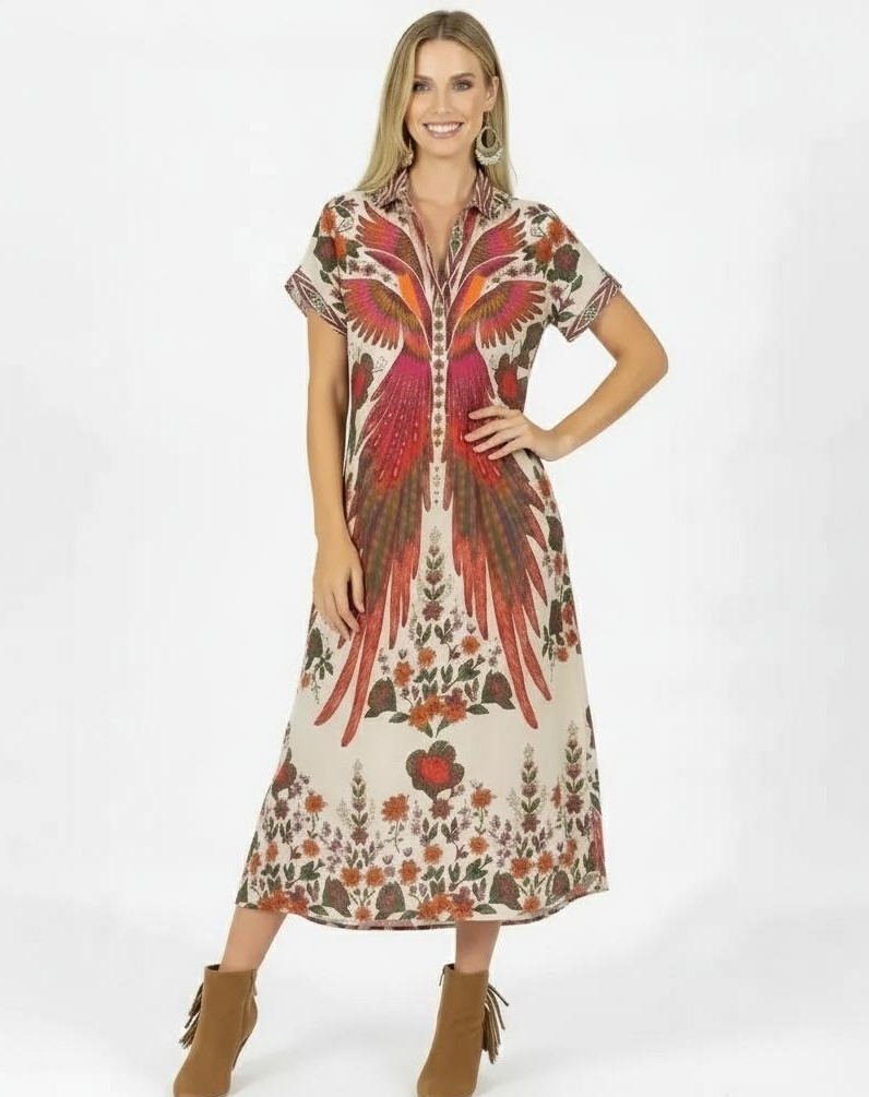 VESTITO LUNGO IN VISCOSA STAMPATA , CON FILO LUREX ORO.SCOLLO A V, ELASTICO IN VITA, MANICHETTA CORTA, DECORAZIONI POM PON IN COTONEFREE SIZE , DISPONIBILE IN 4 COLORI.