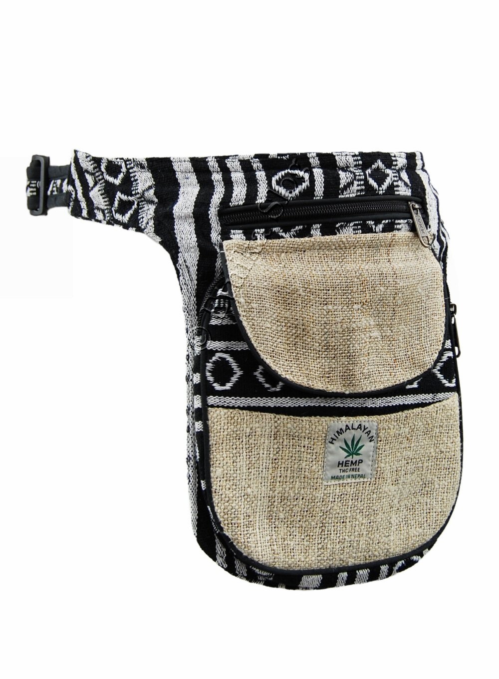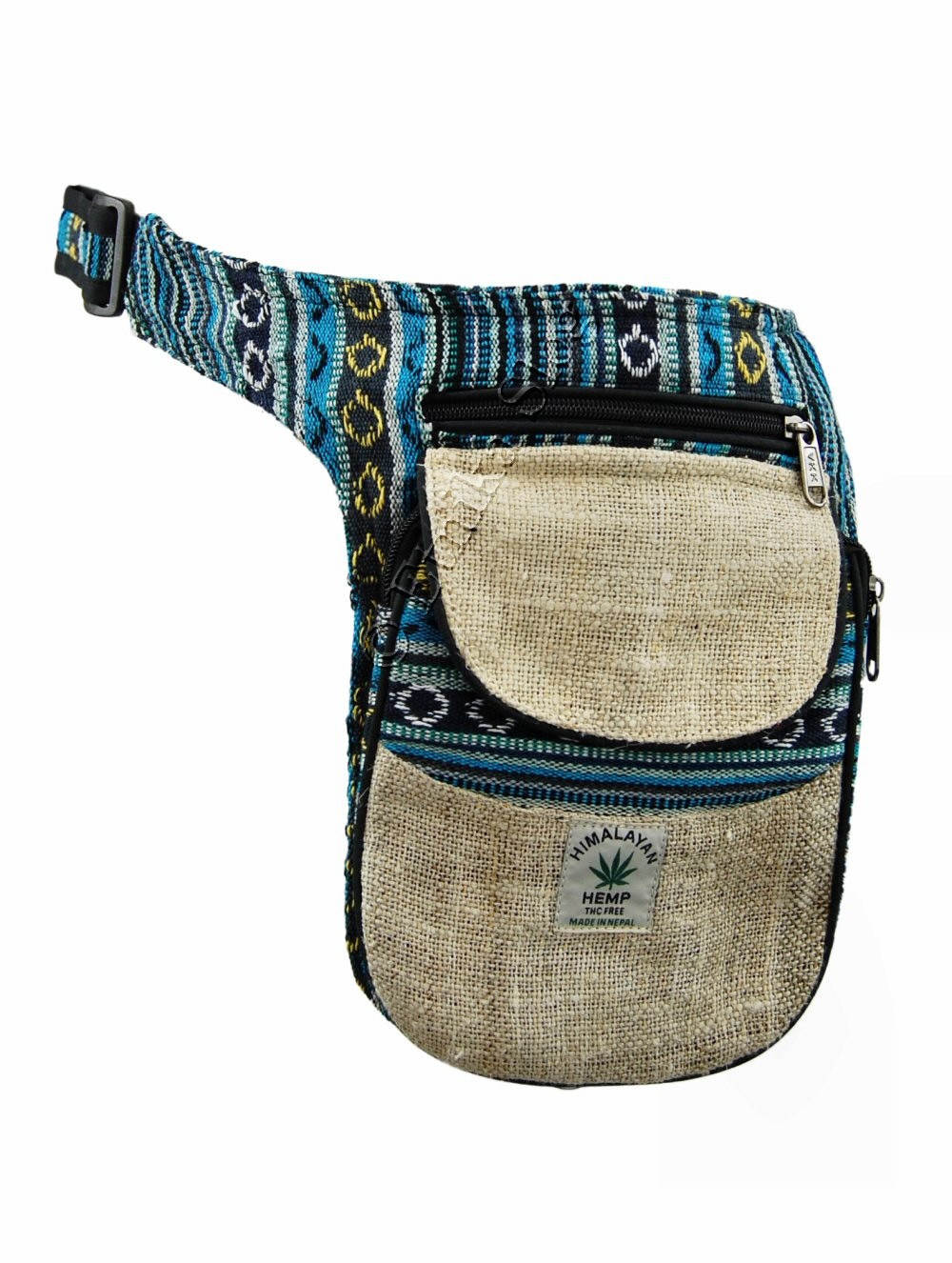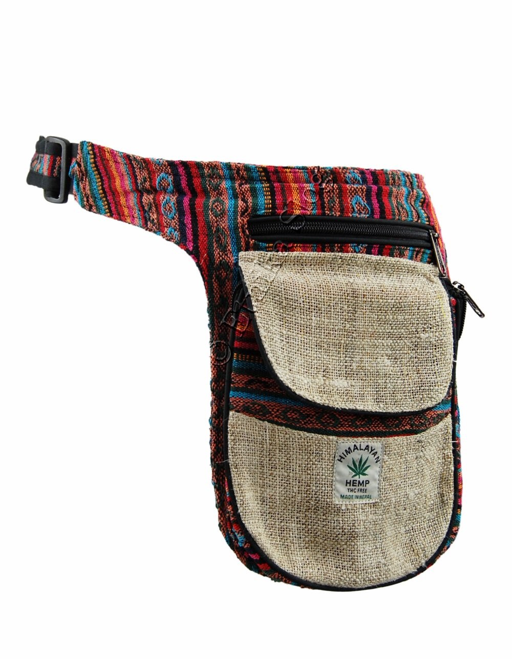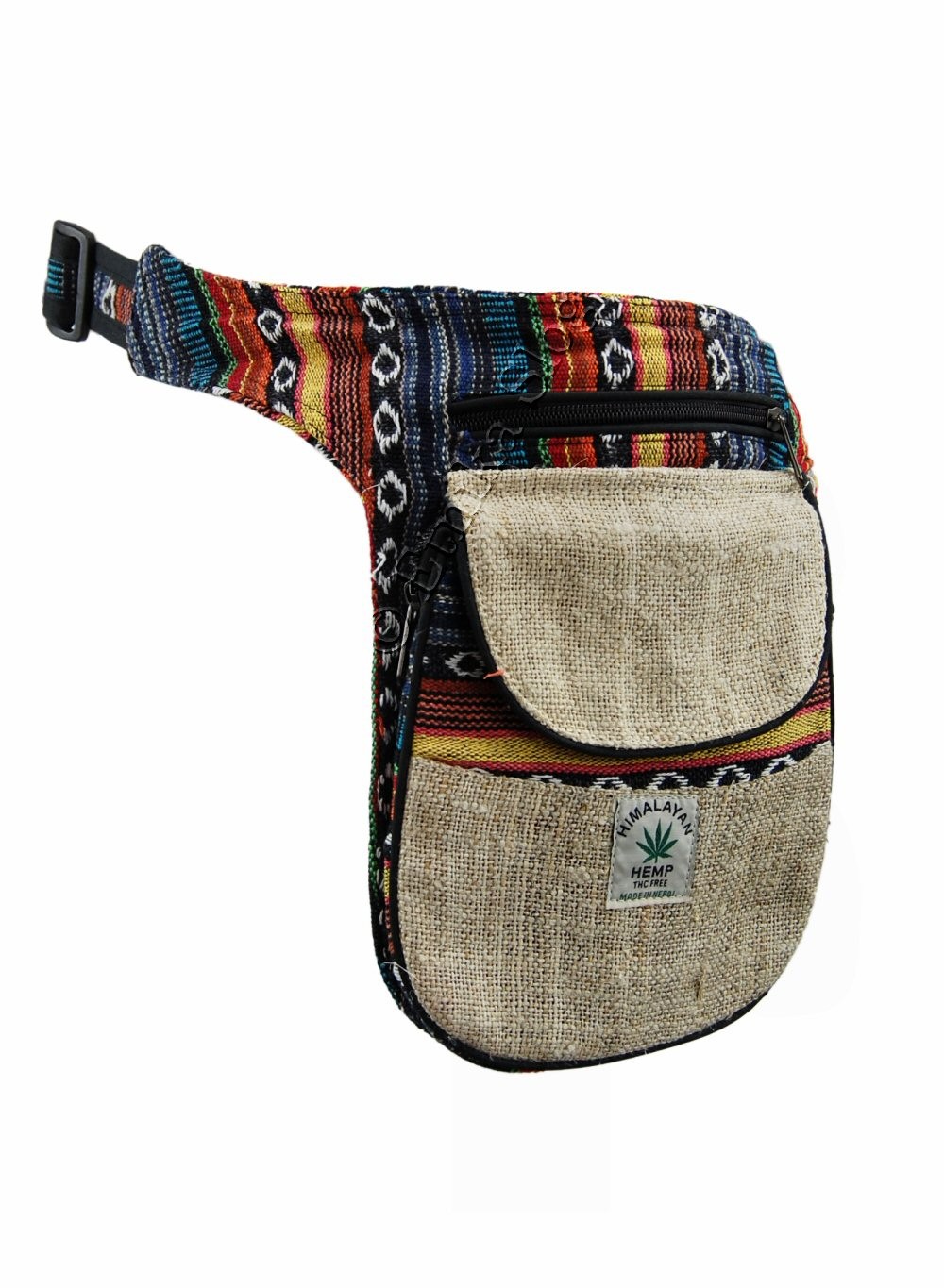 MARSUPIO CON TASCA LATERALE IN CANAPA E COTONE A RIGHE, 3 SCOMPARTI.