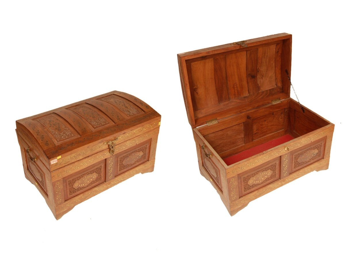 BAULE IN LEGNO MASSICCIO INTAGLIATO E CON INSERTI IN OTTONE,