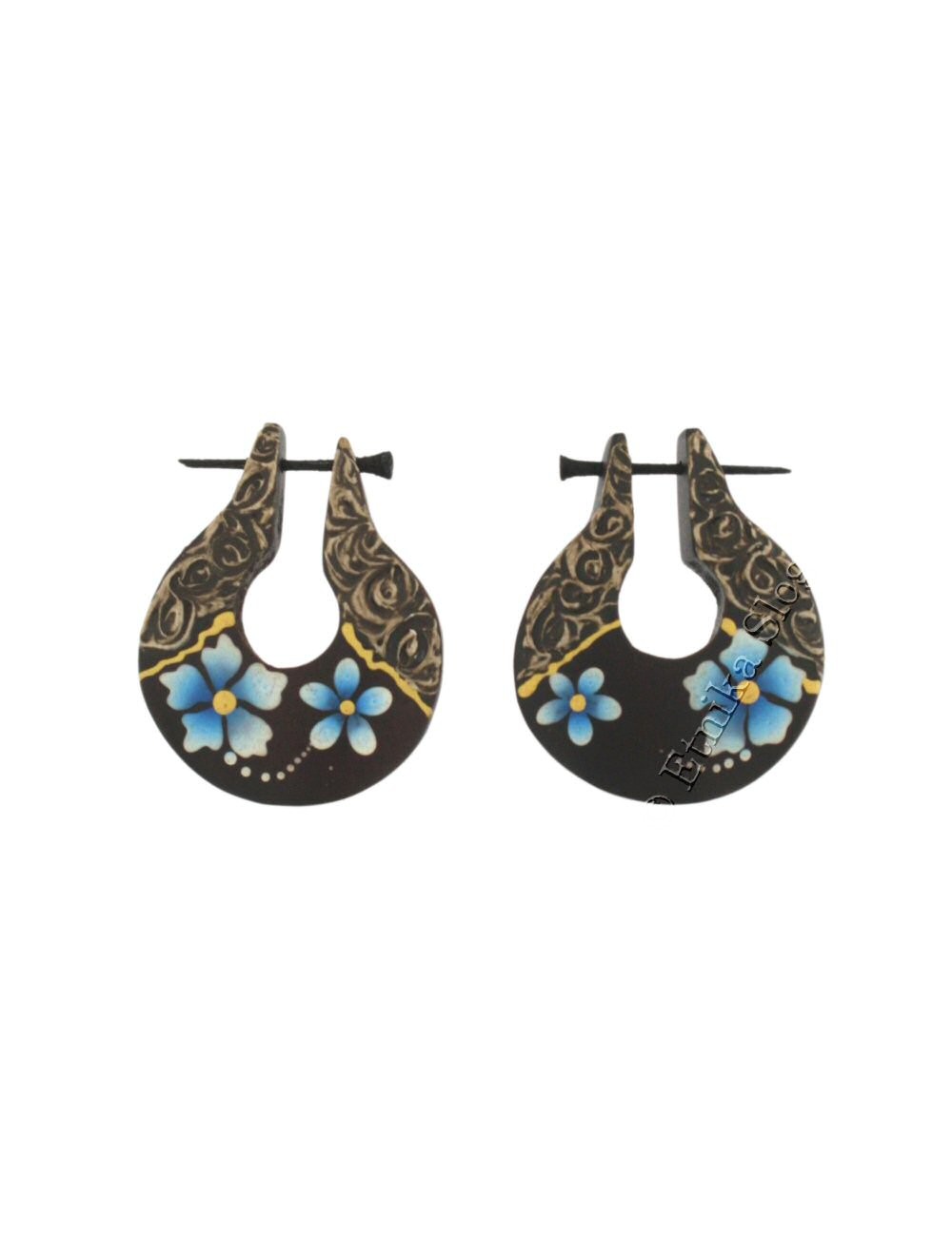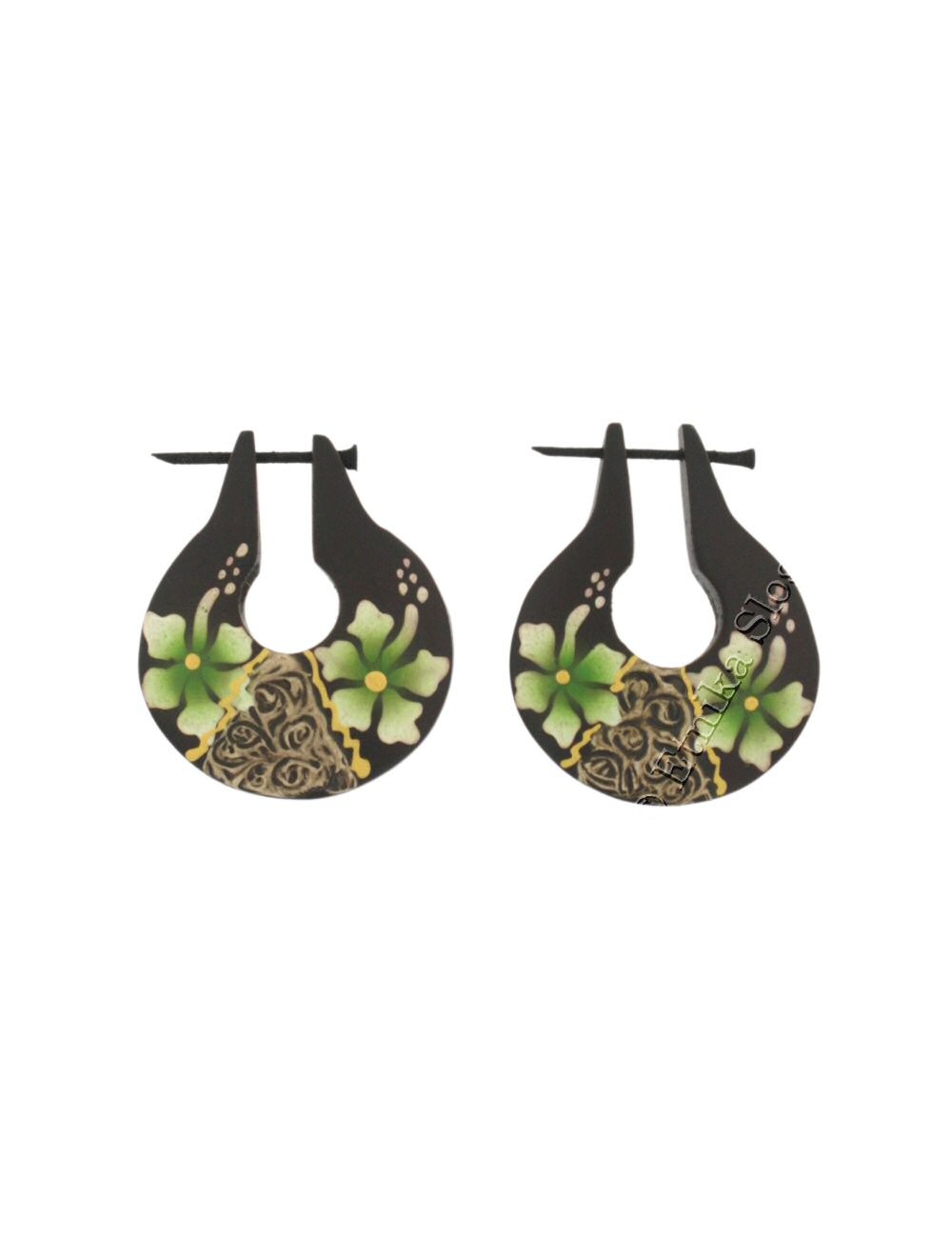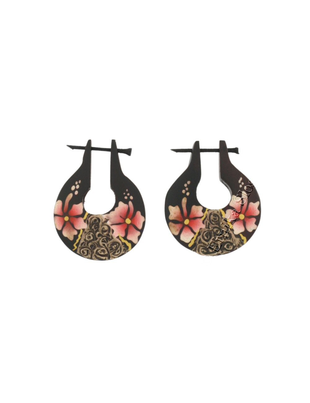 BIGIOTTERIA INDONESIANA ORECCHINI IN LEGNO DIPINTI E INCISI A MANO , CHIUSURA BASTONCINO LEGNO