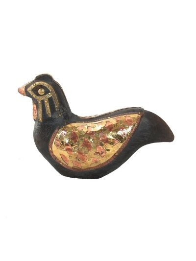 ANIMALE IN LEGNO ANTICATO CON INTARSI IN RAME E OTTONE.