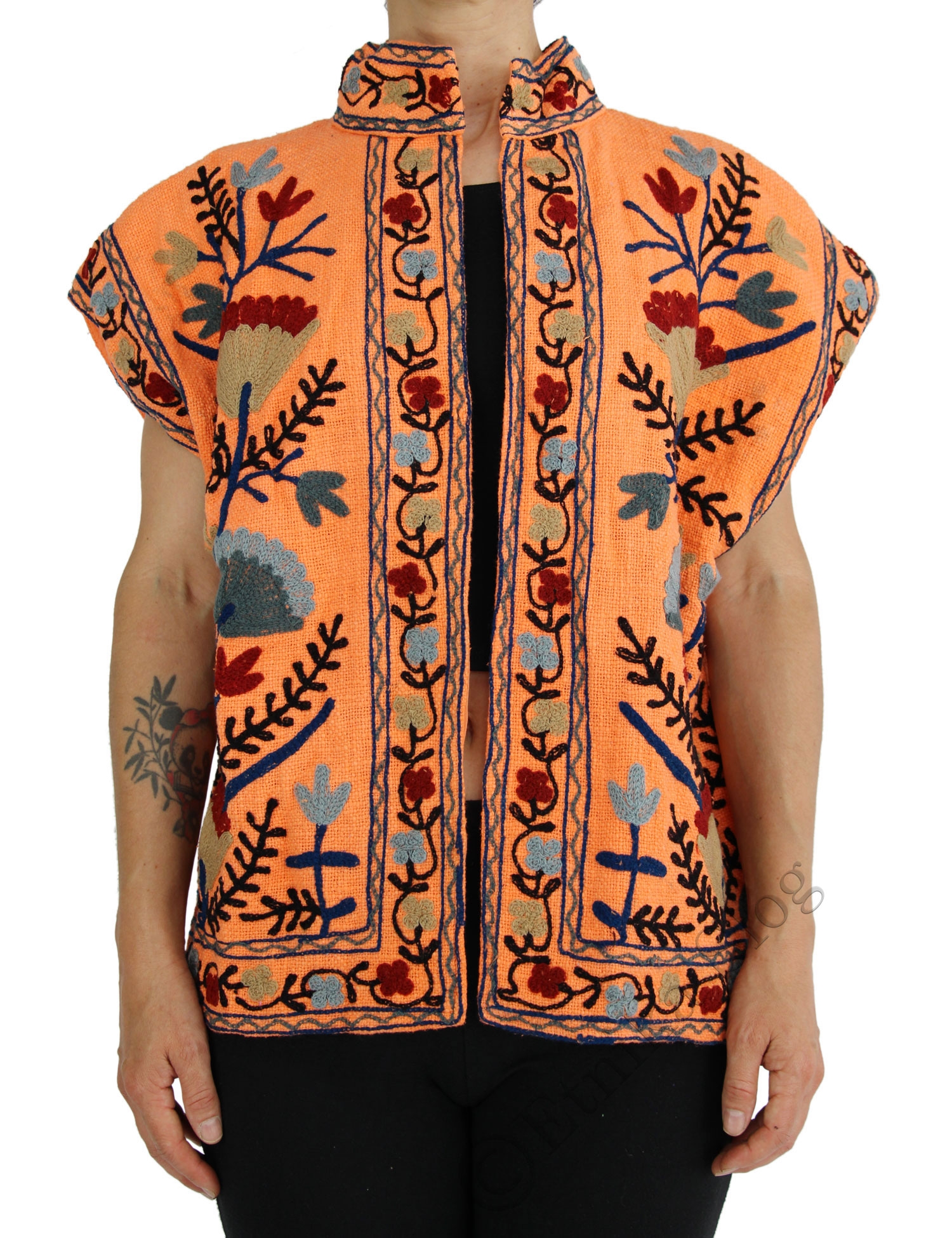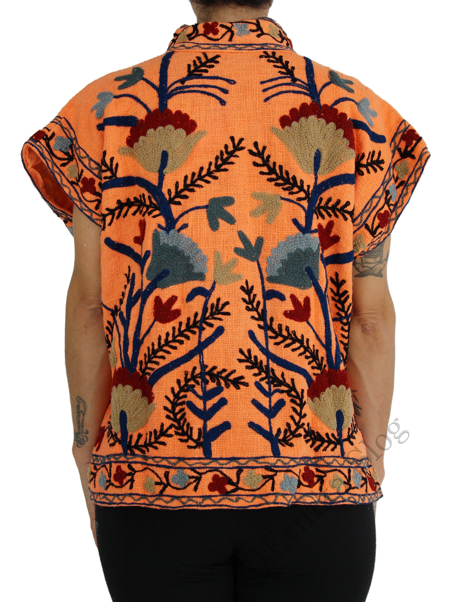 GILET SUZANI RICAMATO, MODELLO GILET SMANICATO QUADRATO IN COTONE TRAMA GROSSA LAVORATO E RICAMATO A MANO CON MANICA CORTA , ALL'INTERNO FODERATO IN COTONE CON COLORE TONO SU TONO.