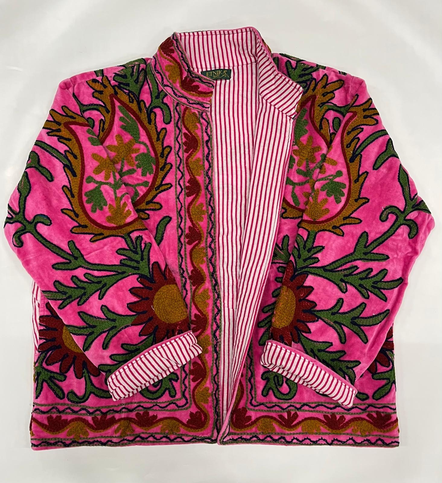 GIACCA SUZANI RICAMATA, MODELLO GIACCHINO CORTO IN VELLUTO LAVORATO E RICAMATO A MANO CON MANICA LUNGA, ALL'INTERNO FODERATO IN COTONE A RIGHE TONO SU TONO.