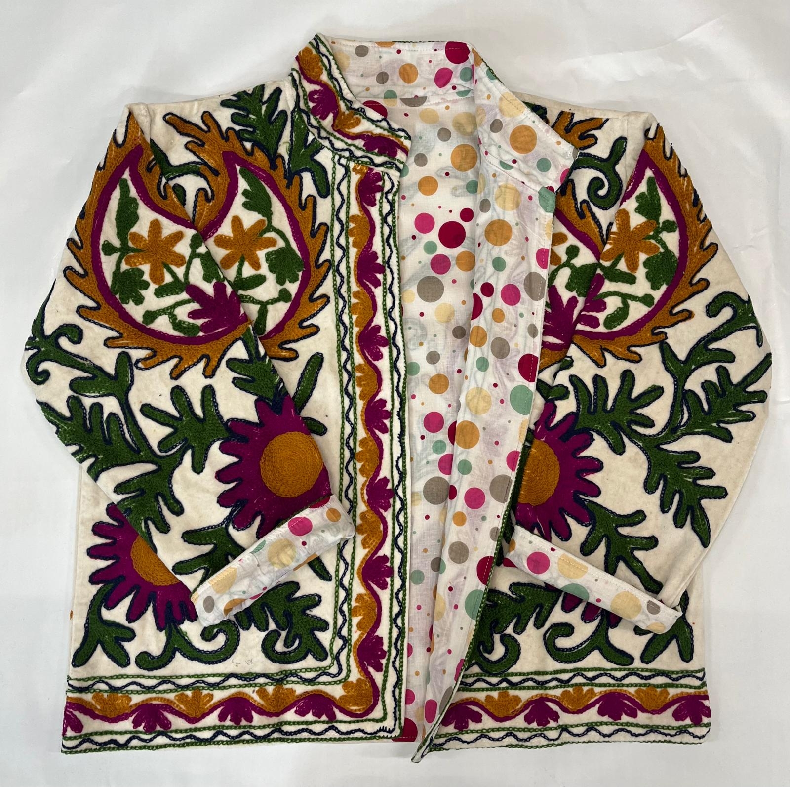 GIACCA SUZANI RICAMATA, MODELLO GIACCHINO CORTO IN VELLUTO LAVORATO E RICAMATO A MANO CON MANICA LUNGA, ALL'INTERNO FODERATO IN COTONE A RIGHE TONO SU TONO.RICAMO MOLTO LAVORATO, CURATO E CONTROLLATOFREE SIZE- RICAMO E COLORE *** COME FOTO - PEZZI LIMITATI