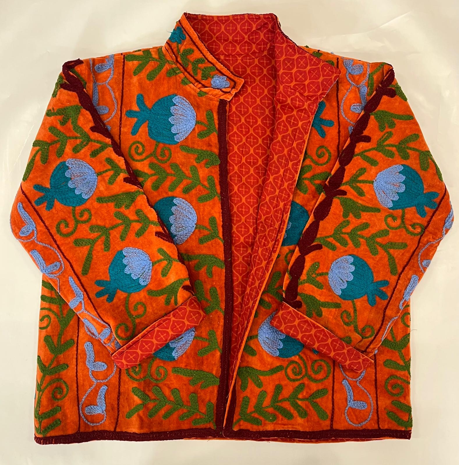 GIACCA SUZANI RICAMATA, MODELLO GIACCHINO CORTO IN VELLUTO LAVORATO E RICAMATO A MANO CON MANICA LUNGA, ALL'INTERNO FODERATO IN COTONE A RIGHE TONO SU TONO.RICAMO MOLTO LAVORATO, CURATO E CONTROLLATOFREE SIZE- RICAMO E COLORE *** COME FOTO - PEZZI LIMITATI
