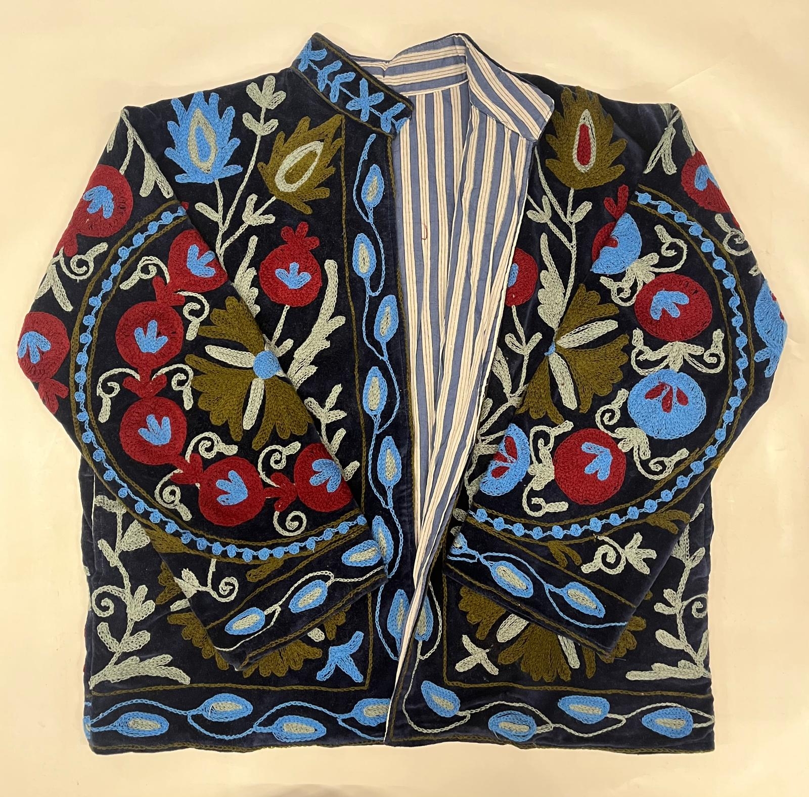 GIACCA SUZANI RICAMATA, MODELLO GIACCHINO CORTO IN VELLUTO LAVORATO E RICAMATO A MANO CON MANICA LUNGA, ALL'INTERNO FODERATO IN COTONE A RIGHE TONO SU TONO, CON 2 TASCHINE.