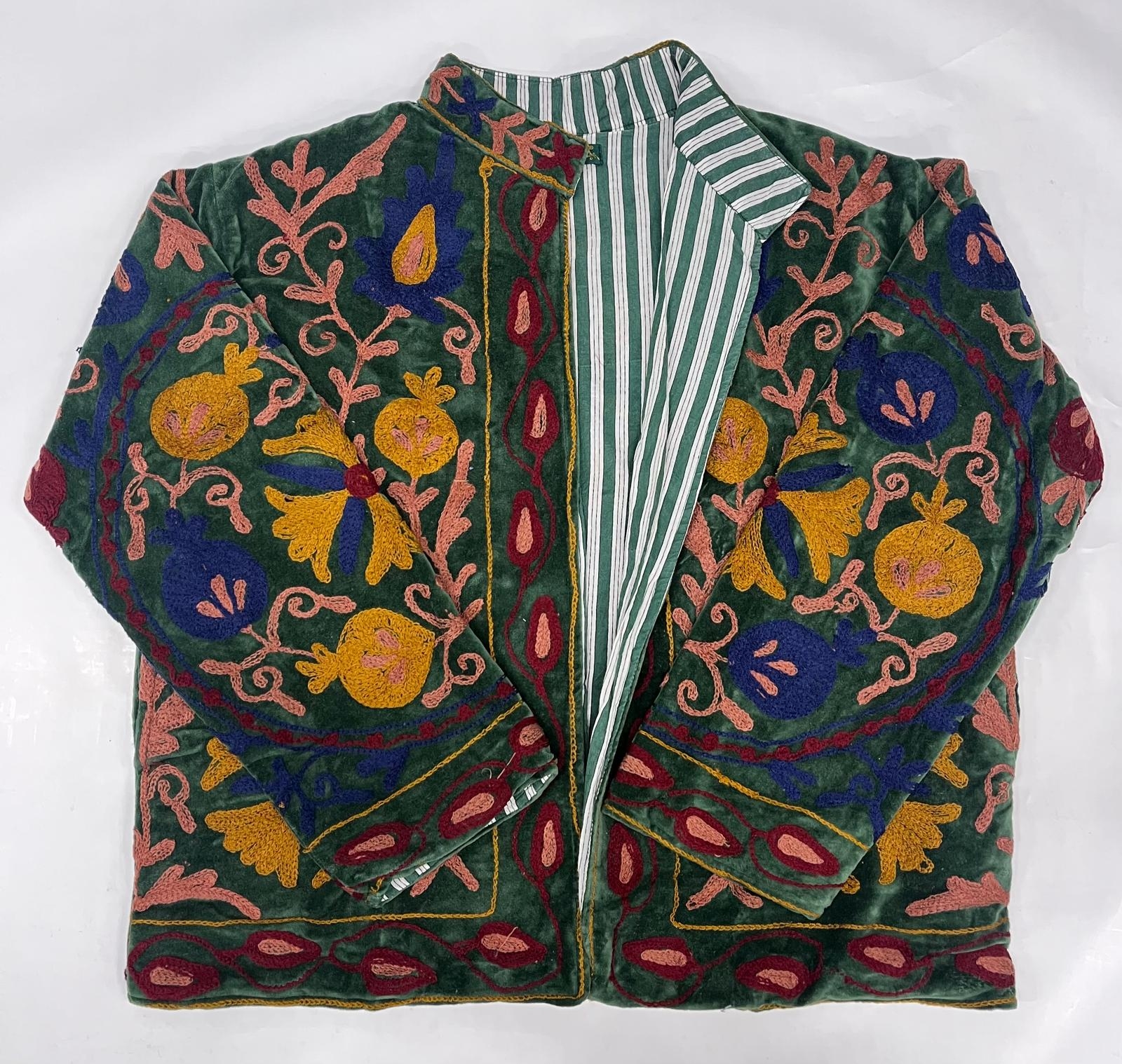 GIACCA SUZANI RICAMATA, MODELLO LARGO , GIACCHINO MEDIOCORTO IN VELLUTO LAVORATO E RICAMATO A MANO CON MANICA LUNGA 2 TASCHE ESTERNE , ALL'INTERNO FODERATO IN COTONE A RIGHE TONO SU TONO CON 2 TASCHINE INTERNE.RICAMO MOLTO LAVORATO, CURATO E CONTROLLATO.FREE SIZE- RICAMO E COLORE ***** COME FOTO - PEZZI LIMITATI
