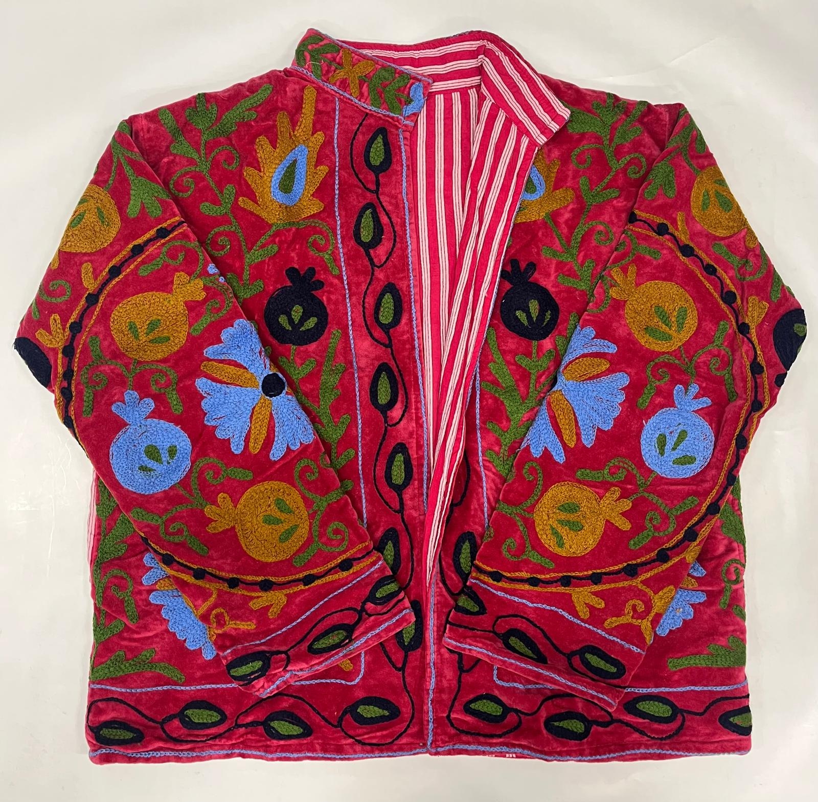 GIACCA SUZANI RICAMATA, MODELLO GIACCHINO CORTO IN VELLUTO LAVORATO E RICAMATO A MANO CON MANICA LUNGA, ALL'INTERNO FODERATO IN COTONE A RIGHE TONO SU TONO, CON 2 TASCHINE.RICAMO MOLTO LAVORATO, CURATO E CONTROLLATOFREE SIZE- RICAMO E COLORE ***** COME FOTO - PEZZI LIMITATI