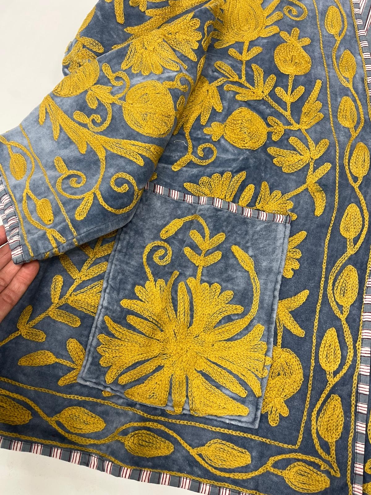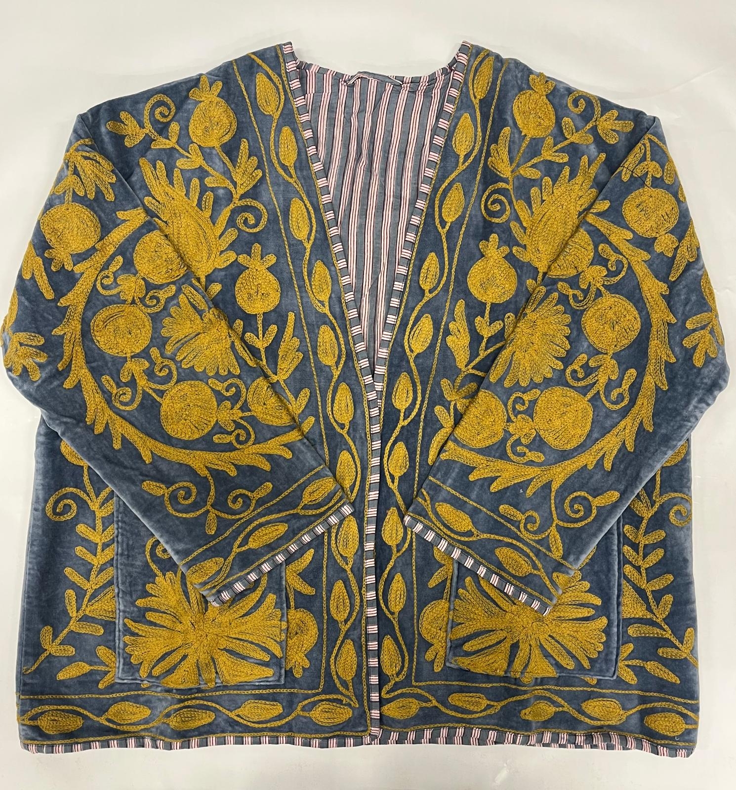 GIACCA SUZANI RICAMATA, MODELLO LARGO , GIACCHINO MEDIOCORTO IN VELLUTO LAVORATO E RICAMATO A MANO CON MANICA LUNGA 2 TASCHE ESTERNE , ALL'INTERNO FODERATO IN COTONE A RIGHE TONO SU TONO CON 2 TASCHINE INTERNE.