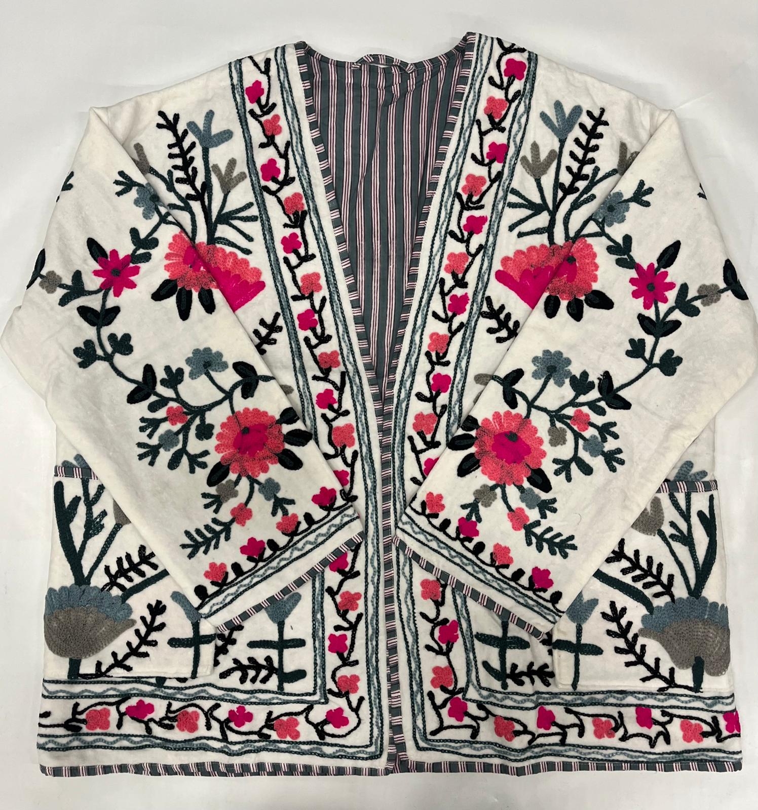 GIACCA SUZANI RICAMATA, MODELLO LARGO , GIACCHINO MEDIOCORTO IN VELLUTO LAVORATO E RICAMATO A MANO CON MANICA LUNGA 2 TASCHE ESTERNE , ALL'INTERNO FODERATO IN COTONE A RIGHE TONO SU TONO CON 2 TASCHINE INTERNE.RICAMO MOLTO LAVORATO, CURATO E CONTROLLATO.FREE SIZE- RICAMO E COLORE ***** COME FOTO - PEZZI LIMITATI