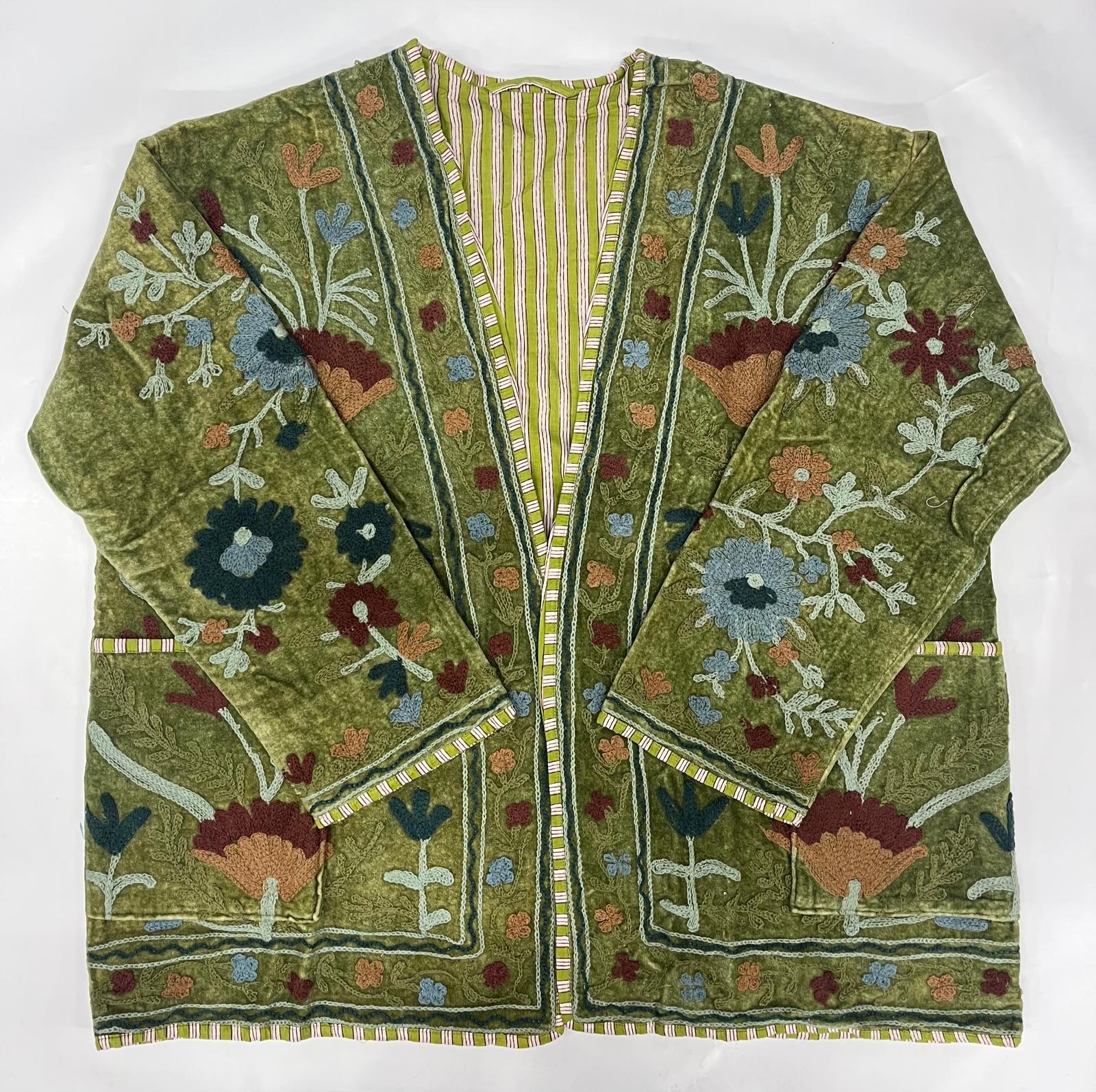 GIACCA SUZANI RICAMATA, MODELLO GIACCHINO CORTO IN VELLUTO LAVORATO E RICAMATO A MANO CON MANICA LUNGA, ALL'INTERNO FODERATO IN COTONE A RIGHE TONO SU TONO, CON 2 TASCHINE.RICAMO MOLTO LAVORATO, CURATO E CONTROLLATOFREE SIZE- RICAMO E COLORE ***** COME FOTO - PEZZI LIMITATI