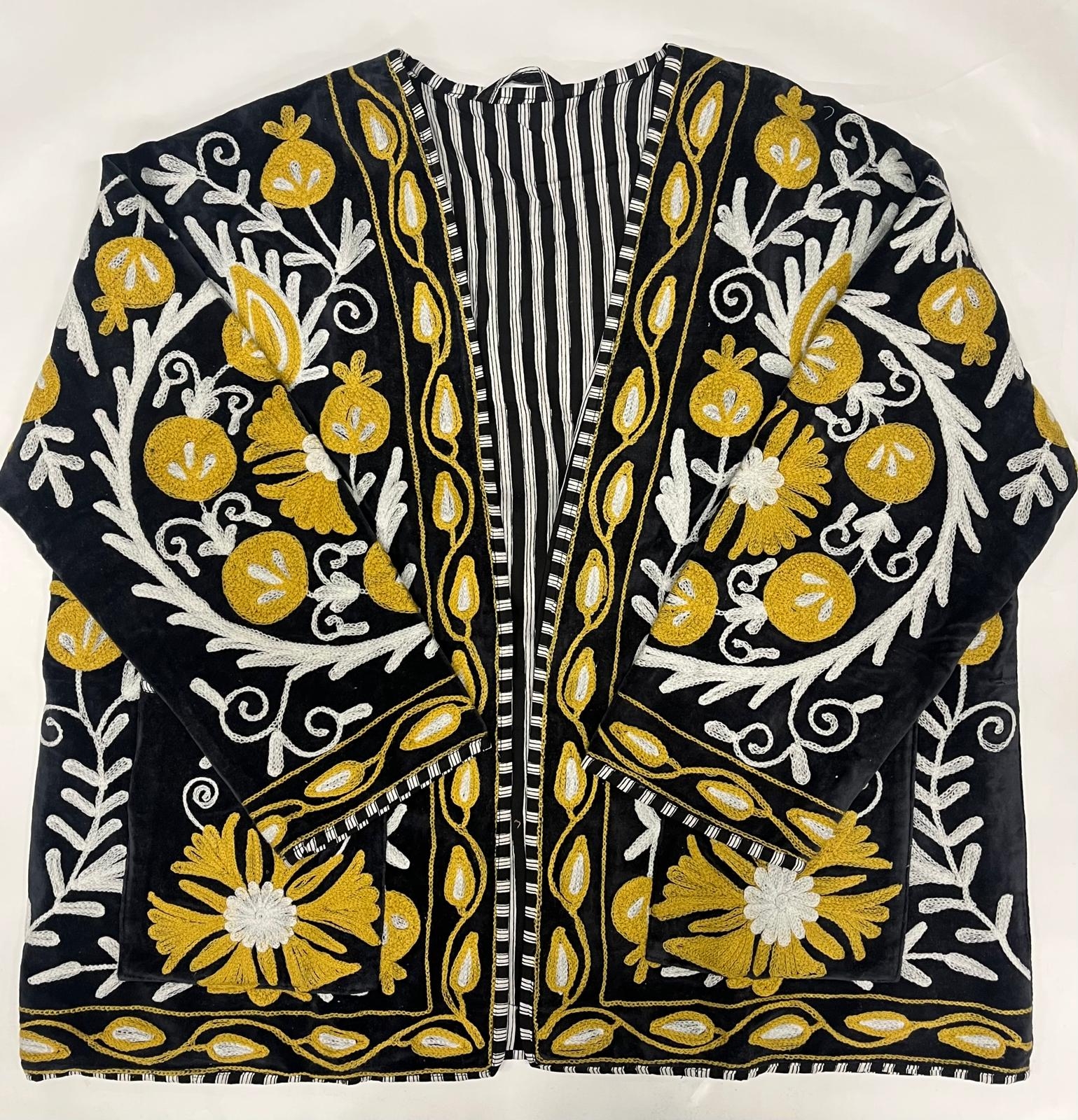 GIACCA SUZANI RICAMATA, MODELLO GIACCHINO CORTO IN VELLUTO LAVORATO E RICAMATO A MANO CON MANICA LUNGA, ALL'INTERNO FODERATO IN COTONE A RIGHE TONO SU TONO, CON 2 TASCHINE.RICAMO MOLTO LAVORATO, CURATO E CONTROLLATOFREE SIZE- RICAMO E COLORE ***** COME FOTO - PEZZI LIMITATI