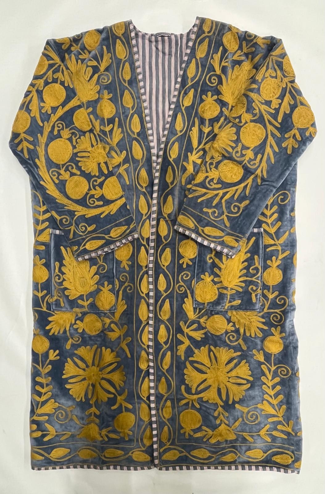 GIACCA SUZANI RICAMATA, MODELLO GIACCA LUNGA IN VELLUTO LAVORATO E RICAMATO A MANO CON MANICA LUNGA 2 TASCHE ESTERNE , ALL'INTERNO FODERATO IN COTONE A RIGHE TONO SU TONO CON 2 TASCHINE INTERNE.