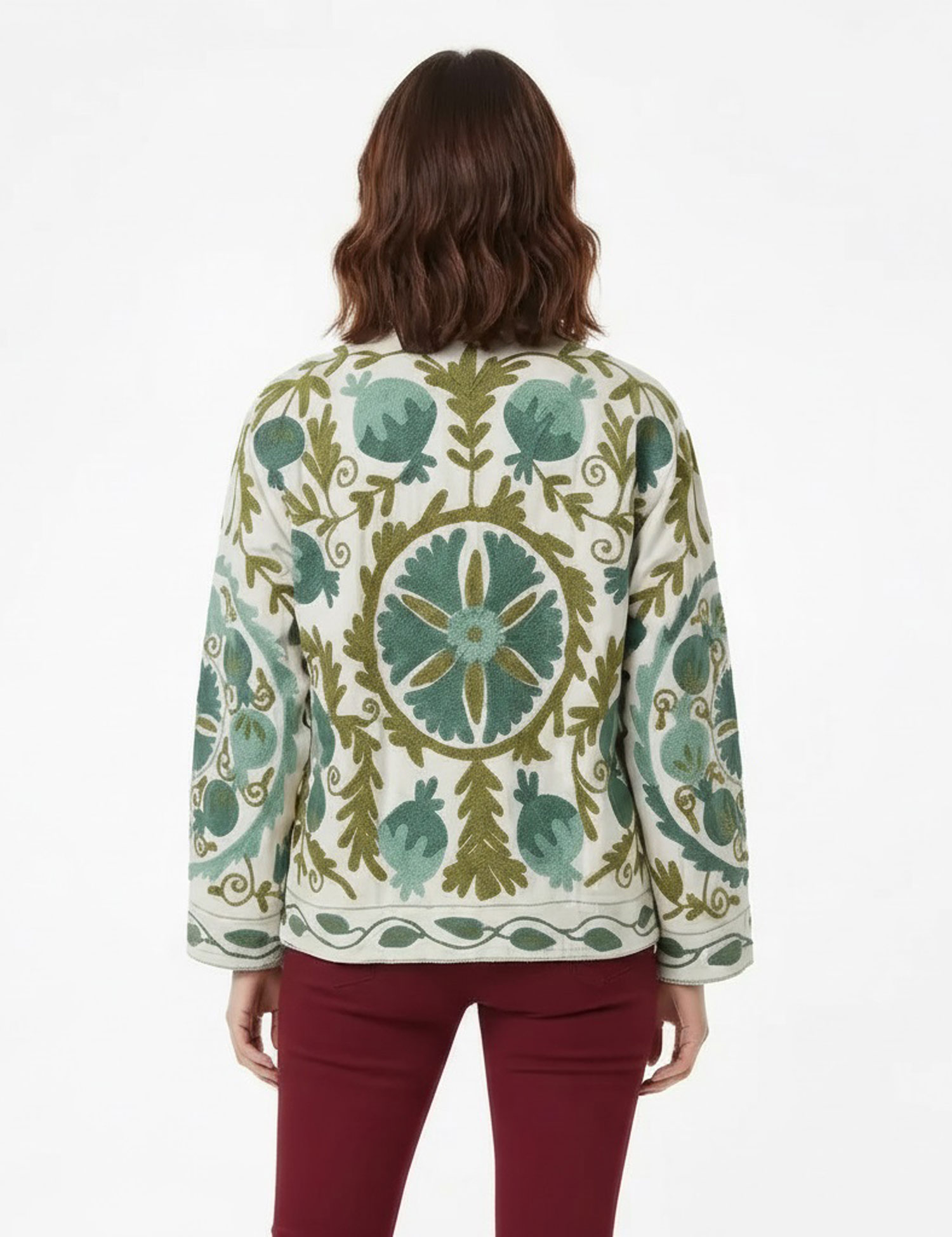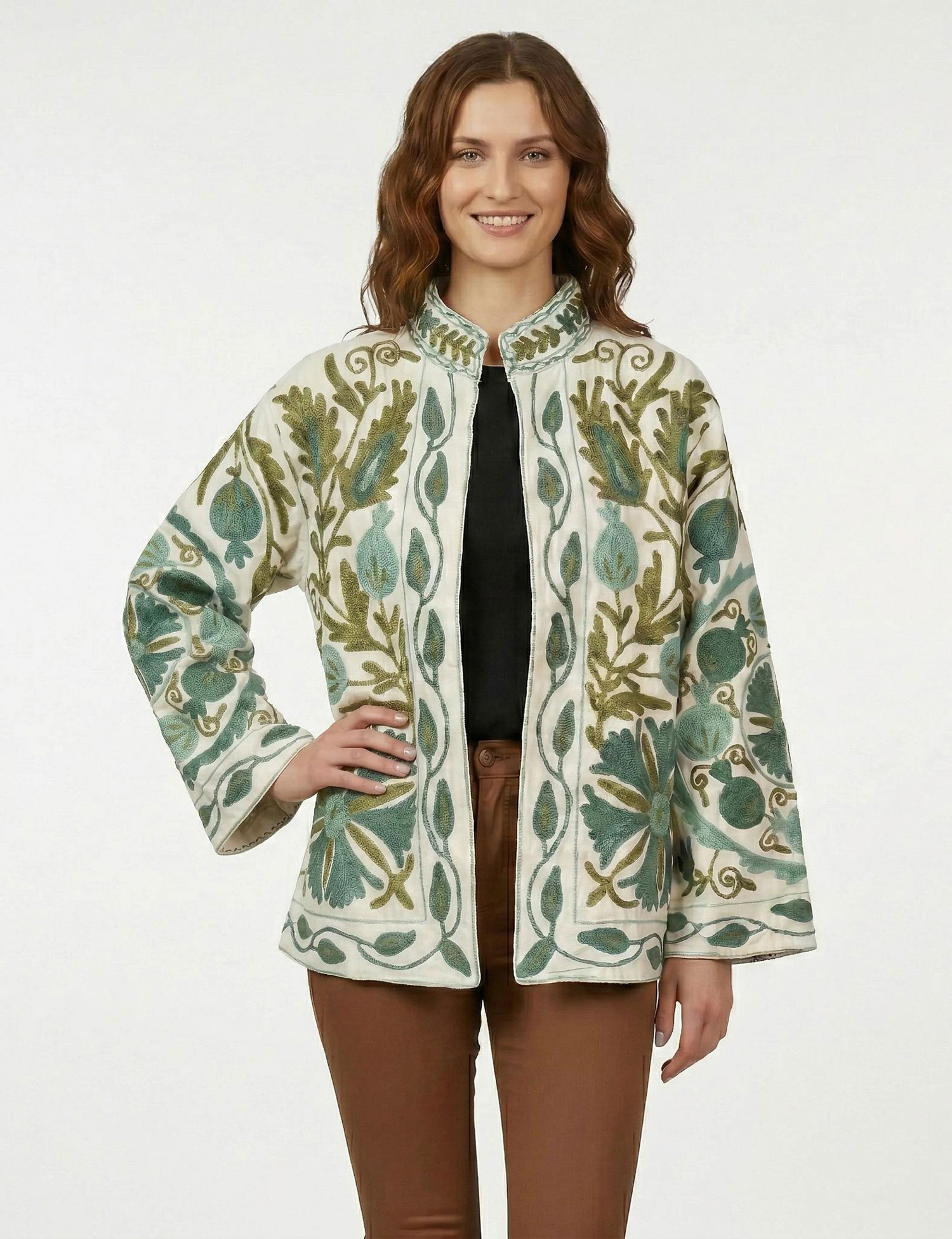 GIACCA SUZANI RICAMATA, MODELLO GIACCHINO CORTO IN COTONE TRAMA FITTA LAVORATO E RICAMATO A MANO CON 2 TASCHE E MANICA LUNGA, ALL'INTERNO FODERATO IN COTONE CON RIGHE.