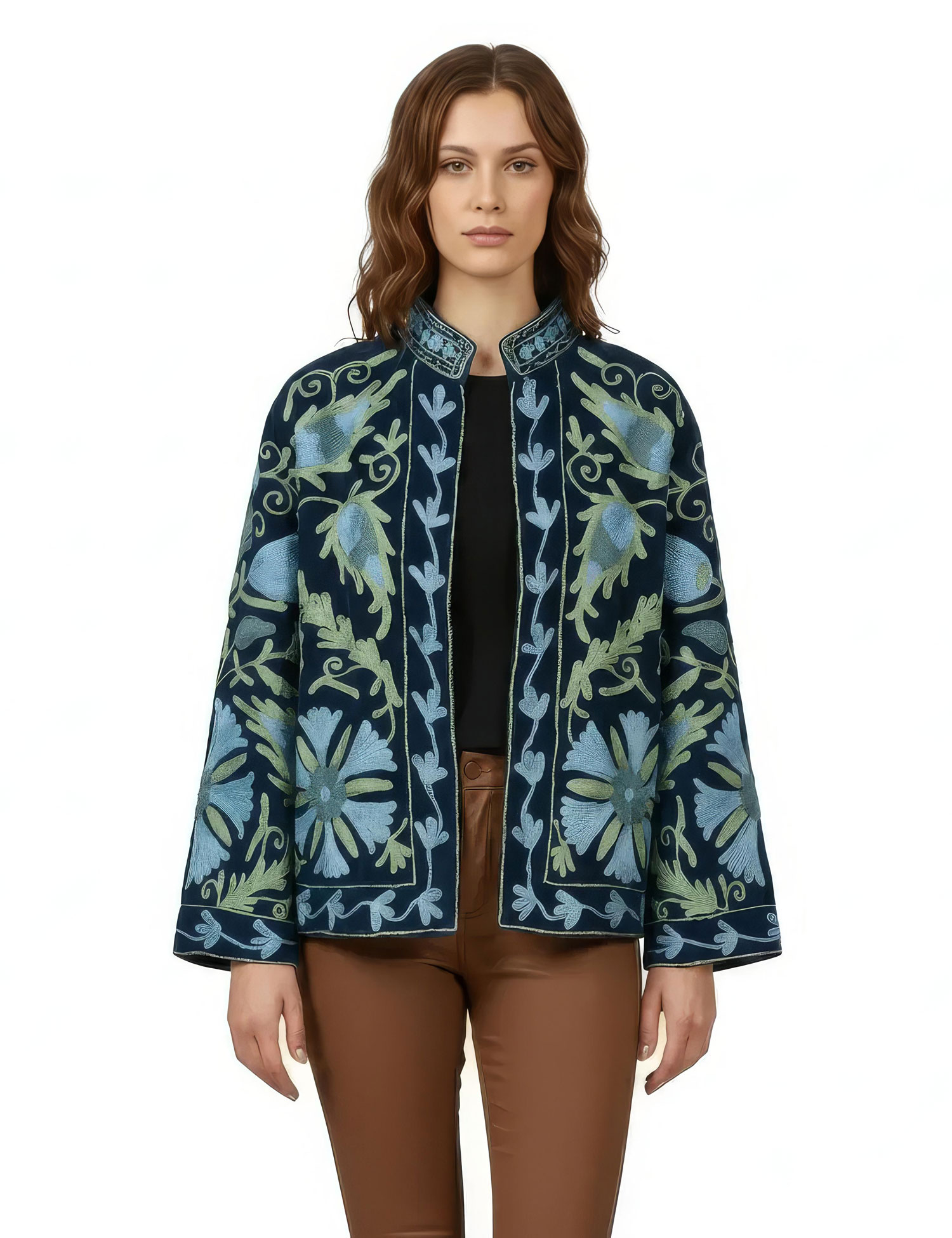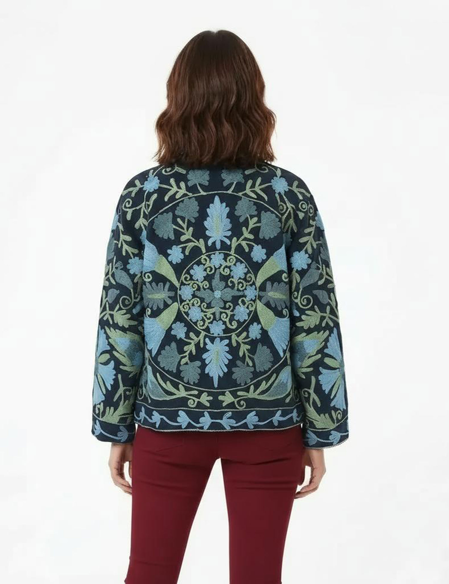 GIACCA SUZANI RICAMATA, MODELLO GIACCHINO CORTO IN COTONE TRAMA FITTA LAVORATO E RICAMATO A MANO CON 2 TASCHE E MANICA LUNGA, ALL'INTERNO FODERATO IN COTONE CON RIGHE.