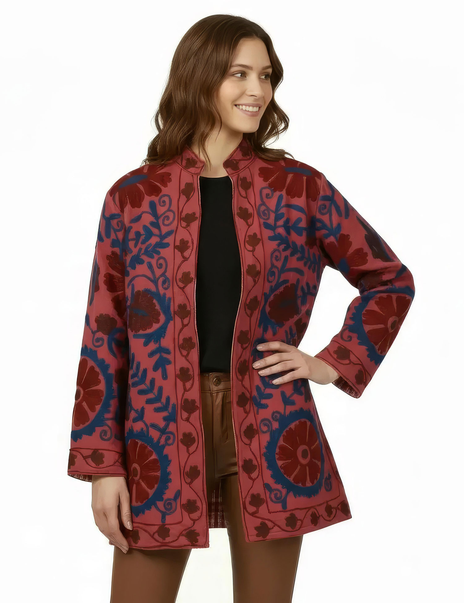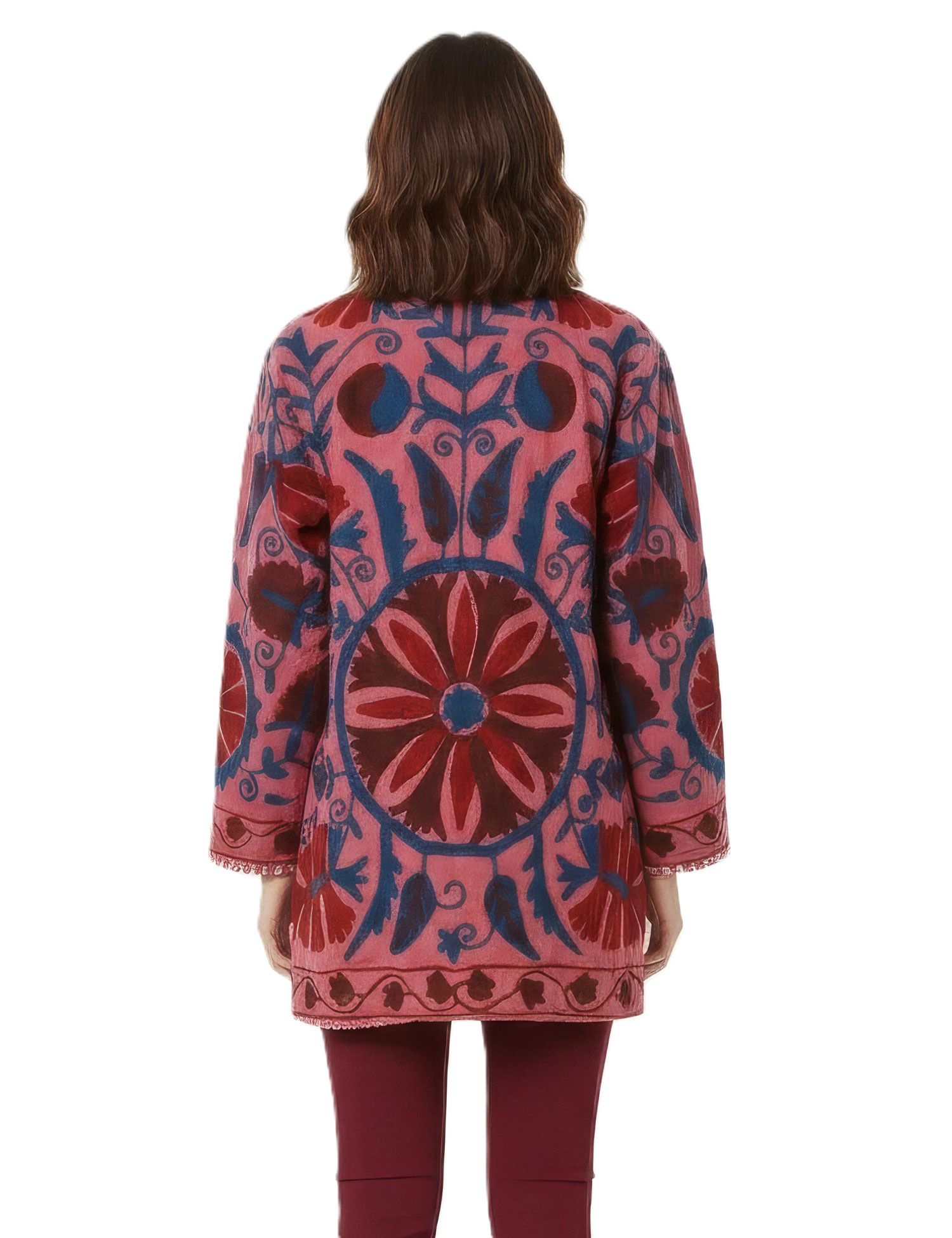 GIACCA SUZANI RICAMATA, MODELLO GIACCHINO MEDIO IN COTONE TRAMA FITTA LAVORATO E RICAMATO A MANO CON 2 TASCHE E MANICA LUNGA, ALL'INTERNO FODERATO IN COTONE CON RIGHE.