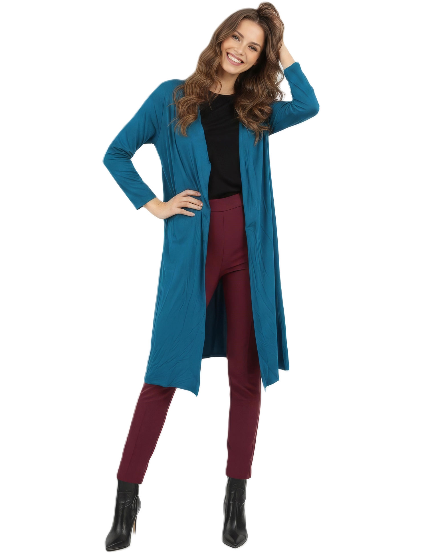CARDIGAN LUNGO SPOLVERINO IN MAGLINA IN TINTA UNITA, CON MANICA LUNGA.MATERIALE : 95% VISCOSA 5% ELASTANE.DISPONIBILE IN VARI COLORI.