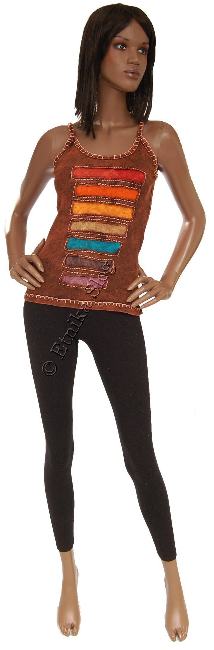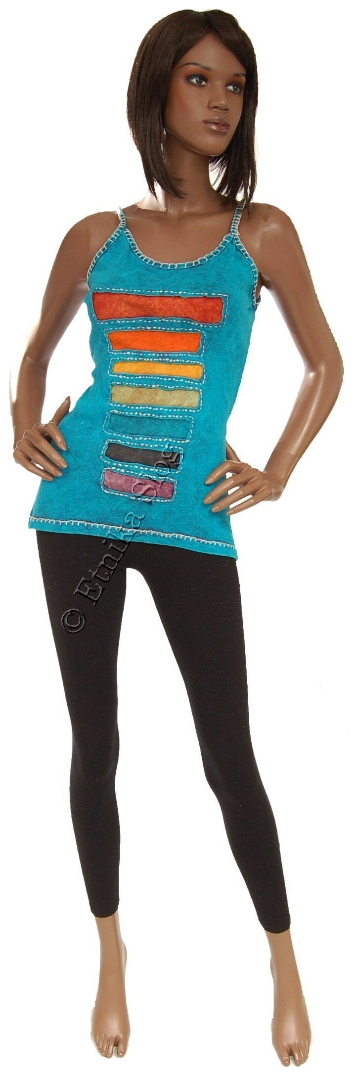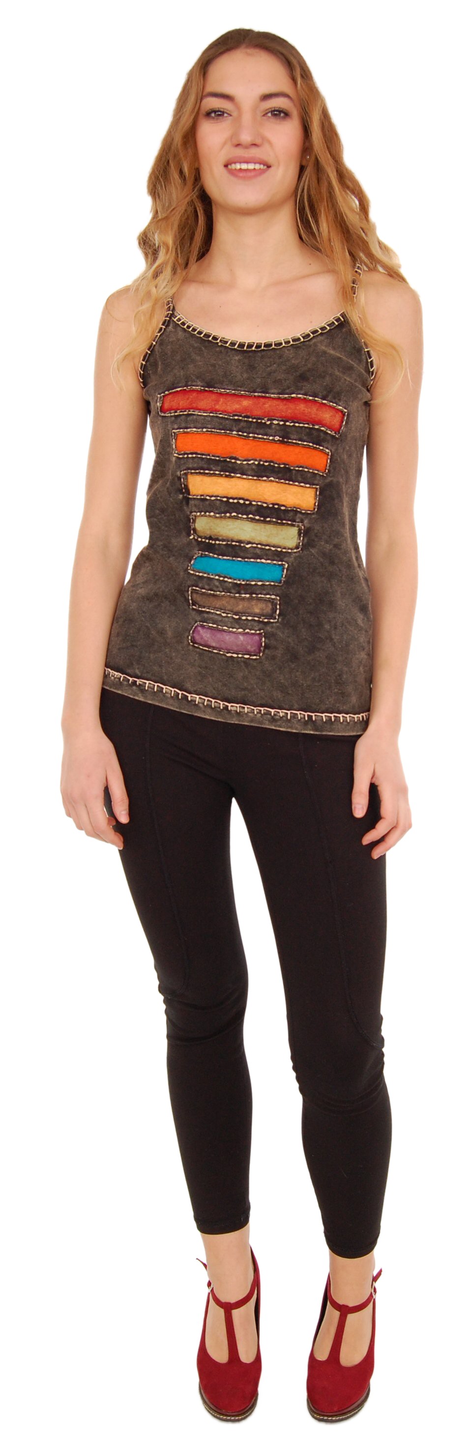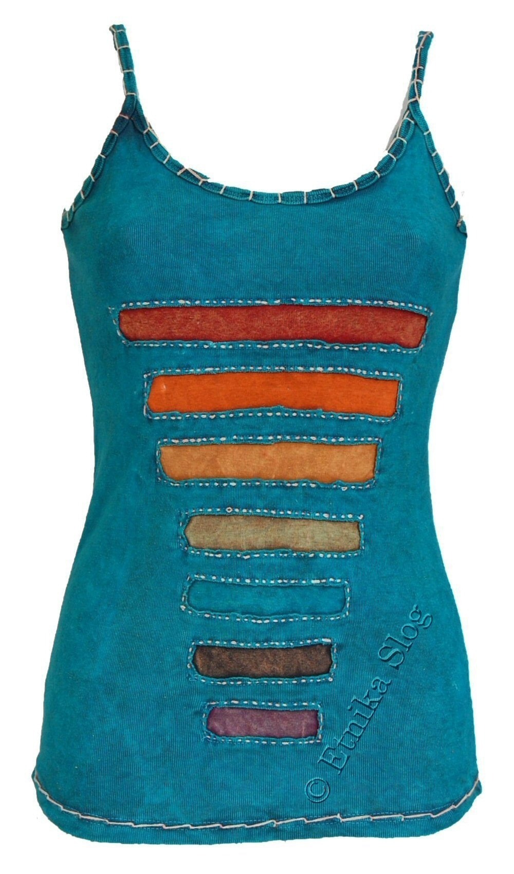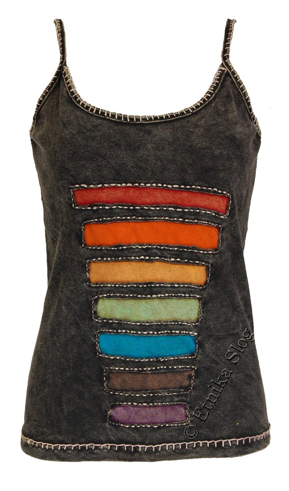 TOP CANOTTA COTONE STONEWASHED, CON INSERTI RETTANGOLARI COLORATI E RICUCITURE.