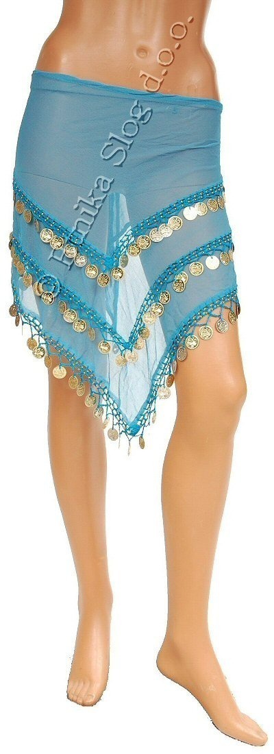 PAREO DANZA DEL VENTRE A TRIANGOLO IN VISCOSA CON RICAMO AD UNCINETTO E 3 LINEE DI MEDAGLIETTE ORO.