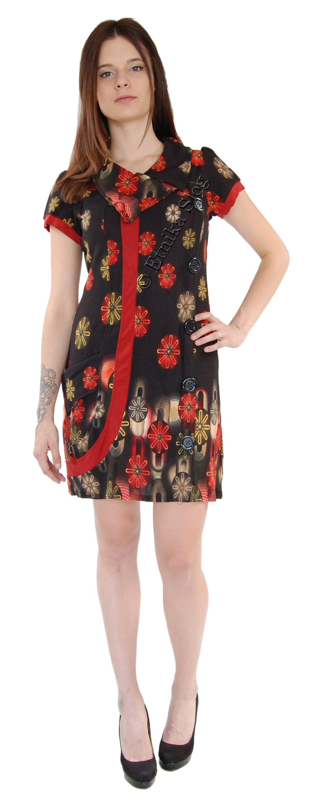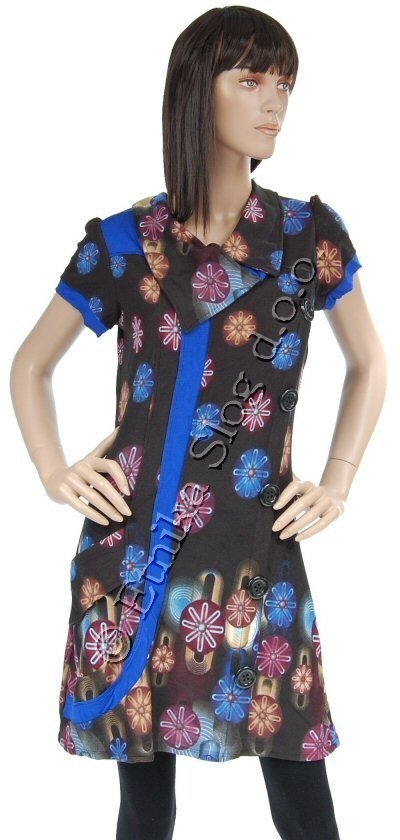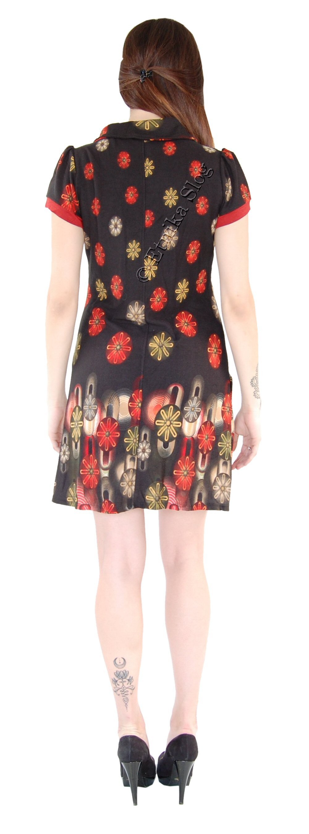 VESTITO MANICA CORTA IN TESSUTO CON ELASTAN, COLLO CON BOTTONE E 4 BOTTONI SU FIANCO.FANTASIA STELLE.