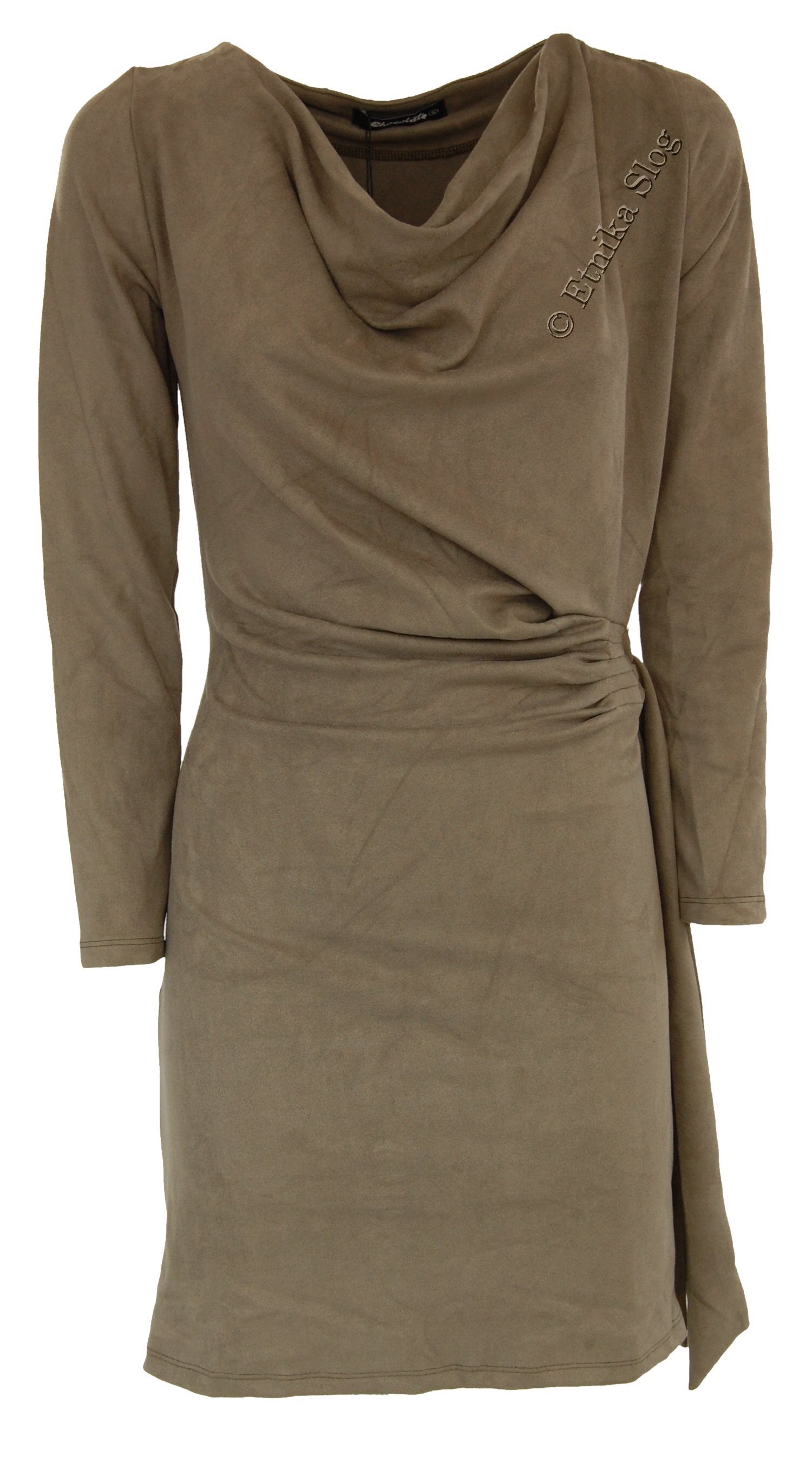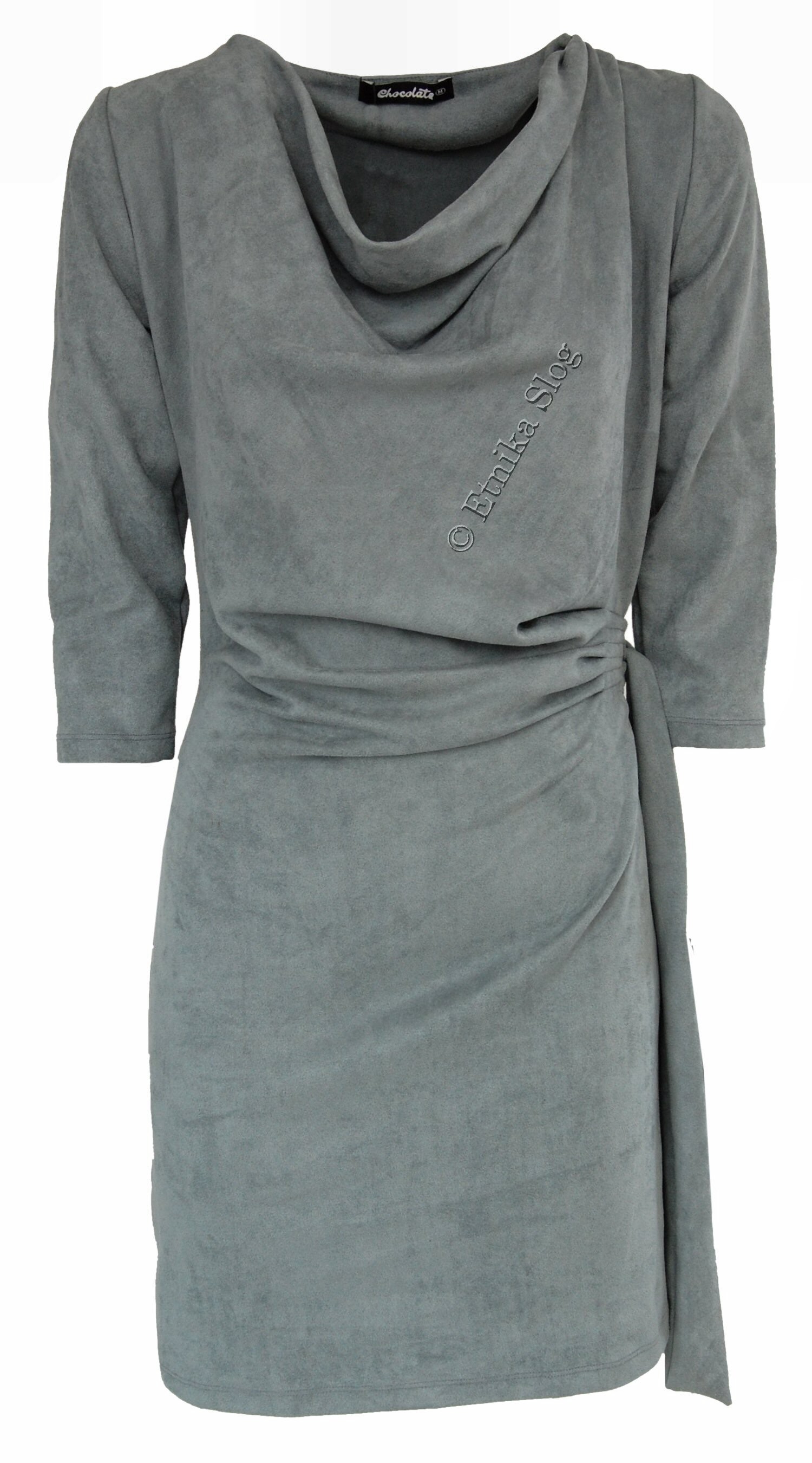 VESTITO IN SIMILPELLE SCAMOSCIATA, COLLO A DRAPPO, MANICHE A 3/4.